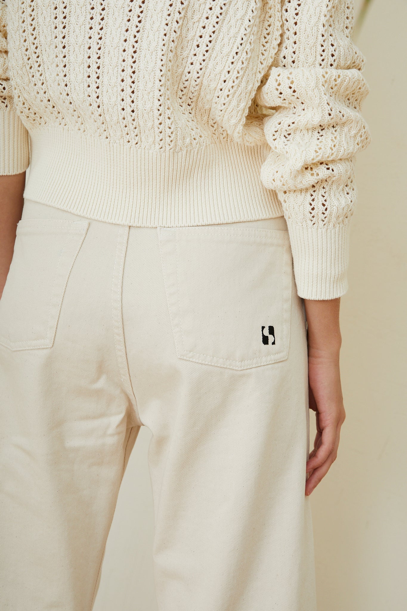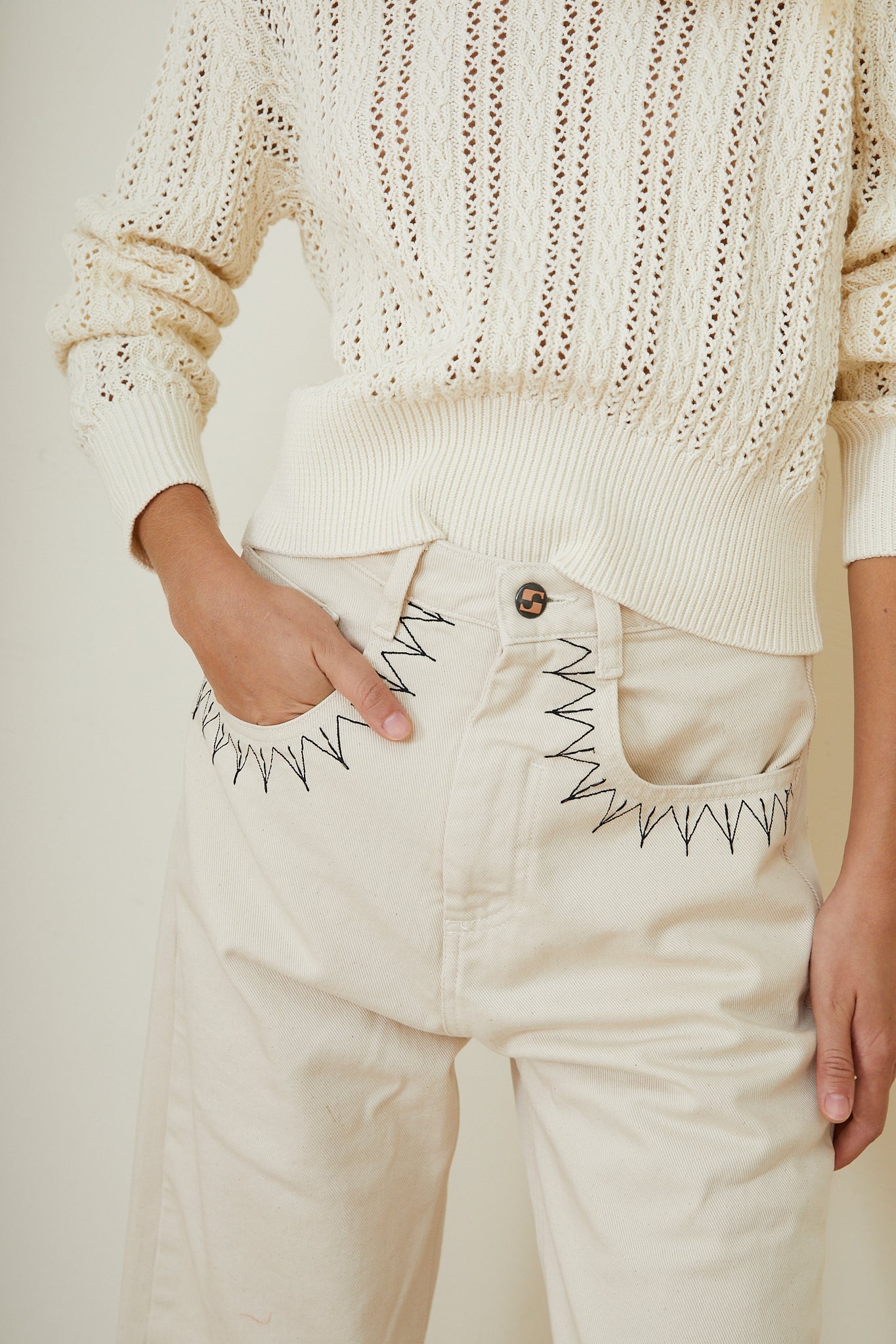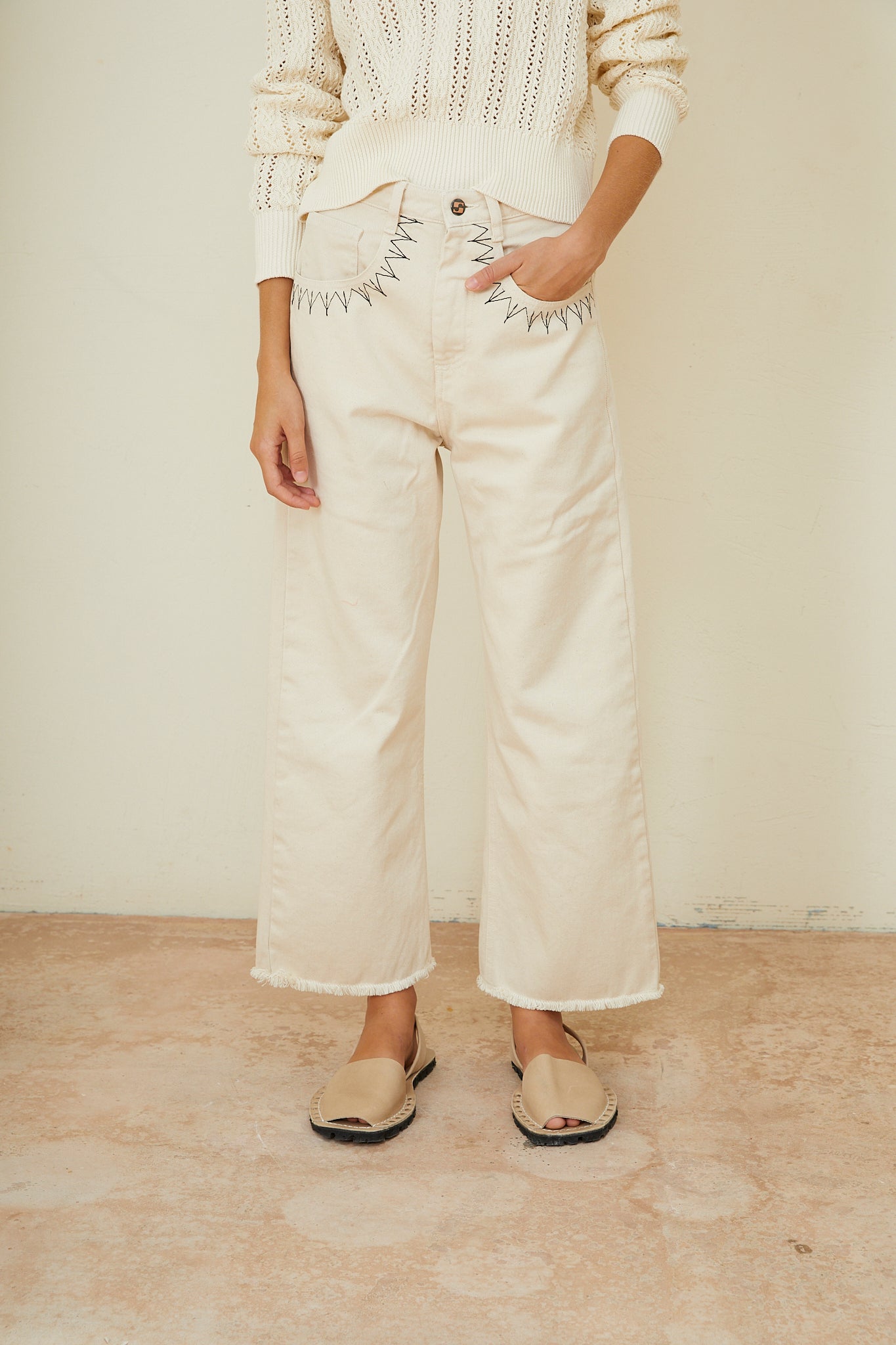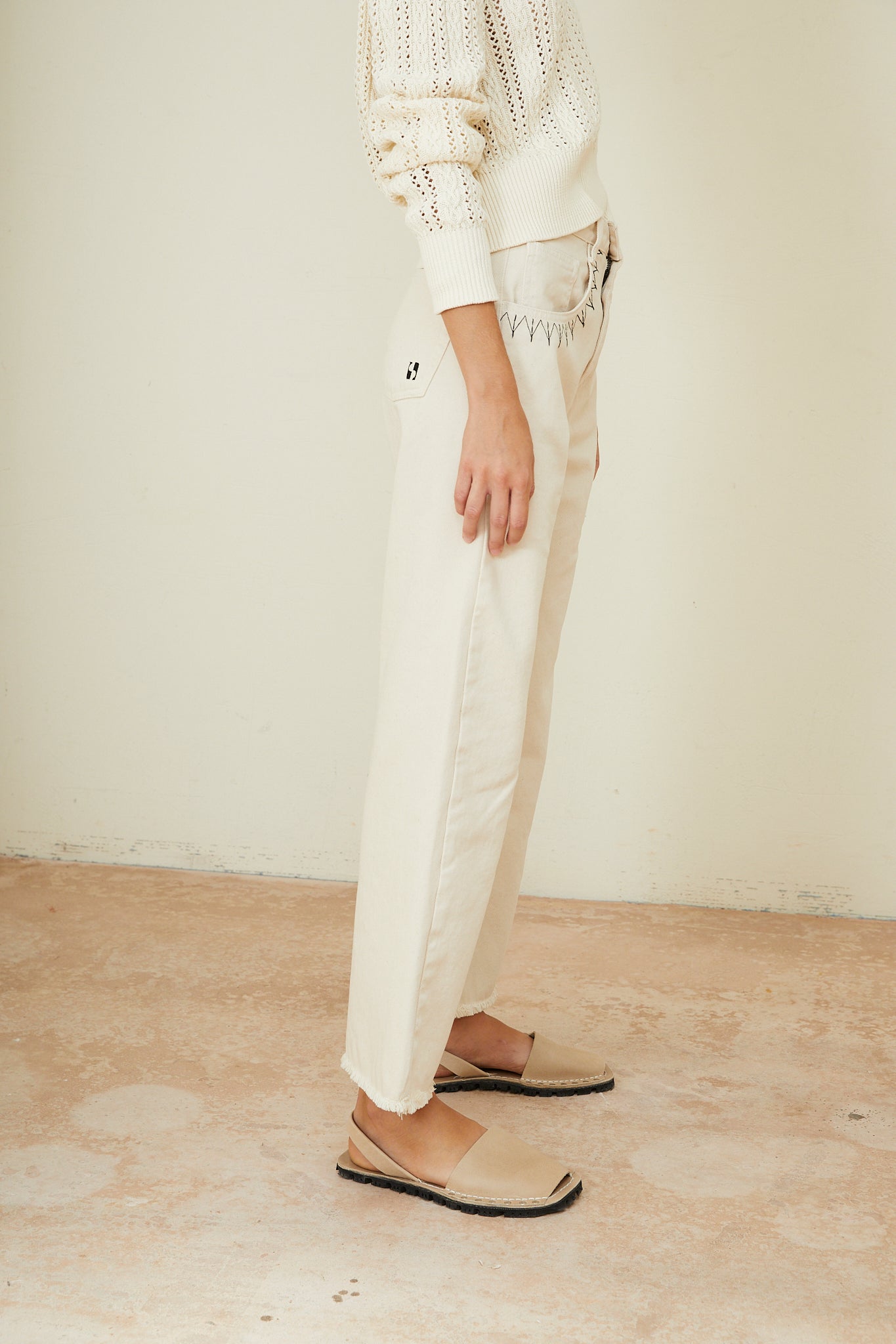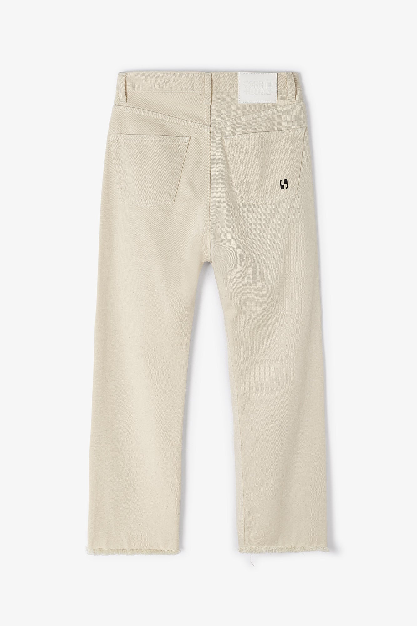 Vaquero de tiro alto crop tipo flare, confeccionado en tejido sarga 100% algodón en color crudo. Con fit entallado y acabado en el bajo con un ligero evasé. Cierre con cremallera y botón central. Detalle de bordado en los bolsillos delanteros.