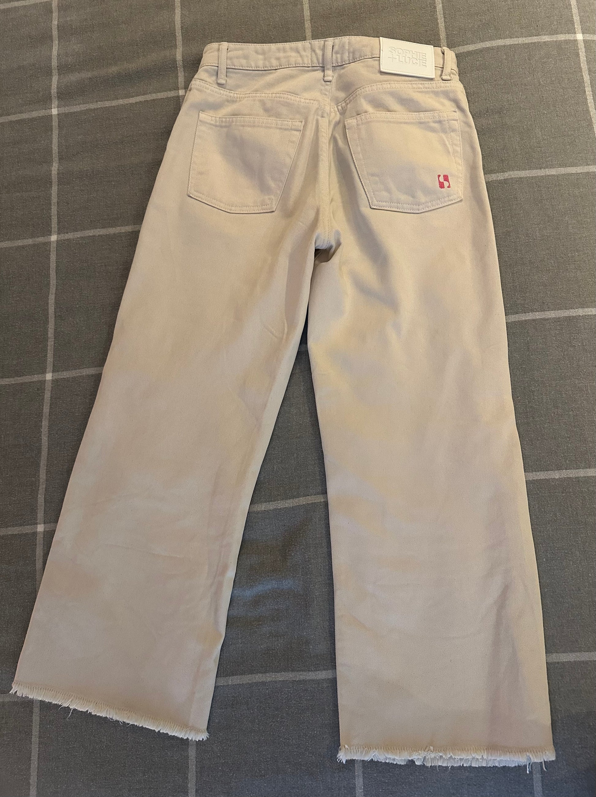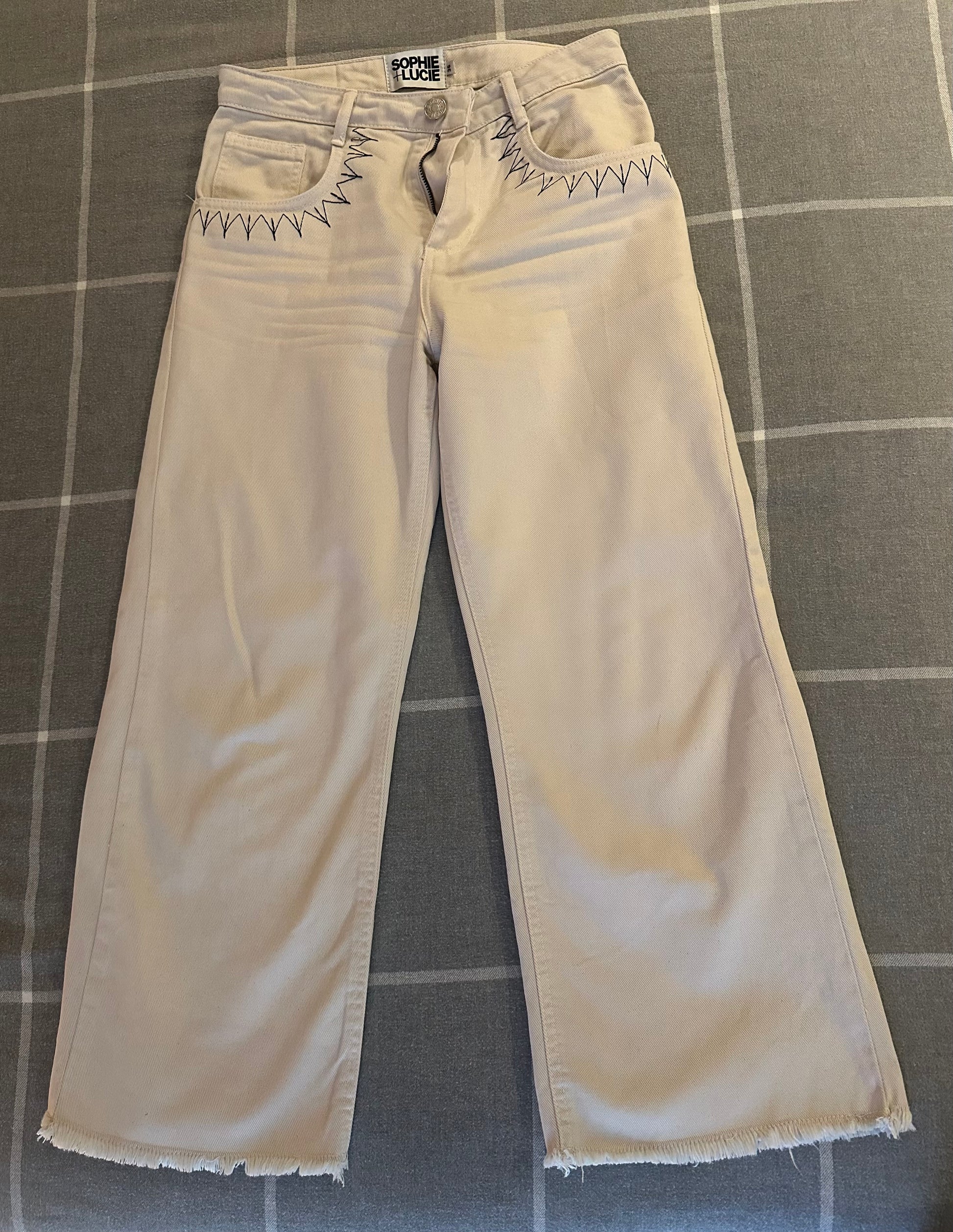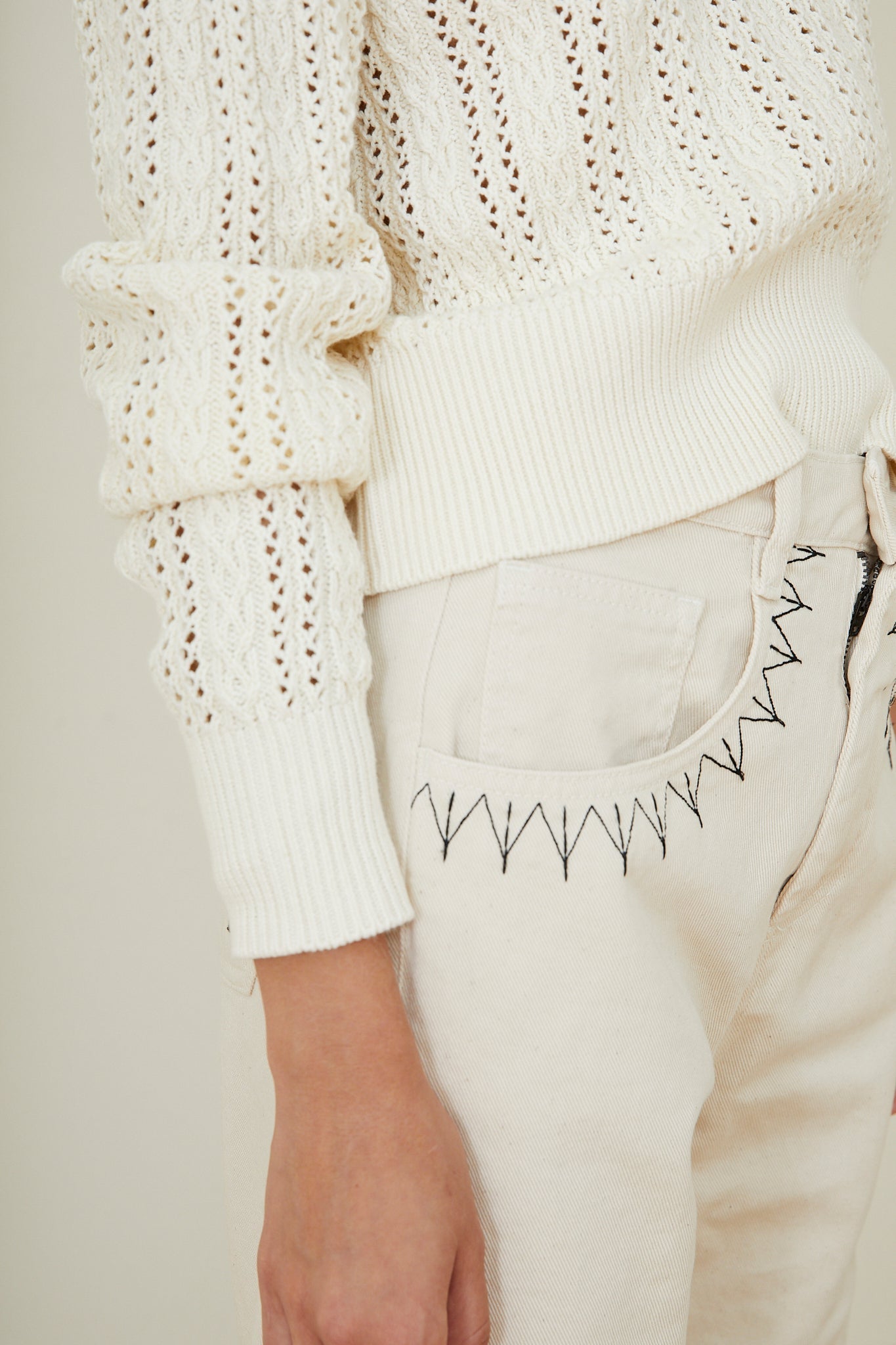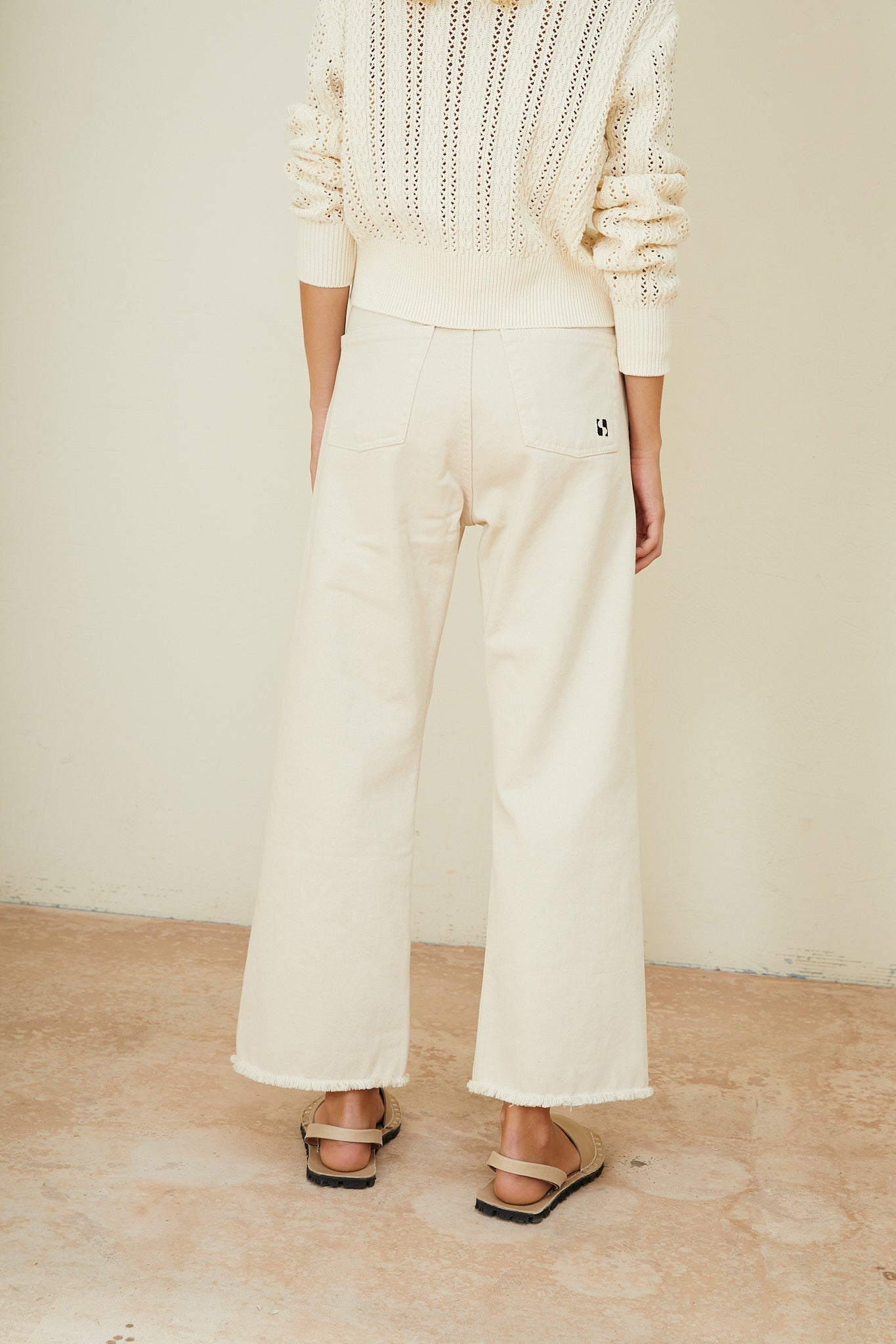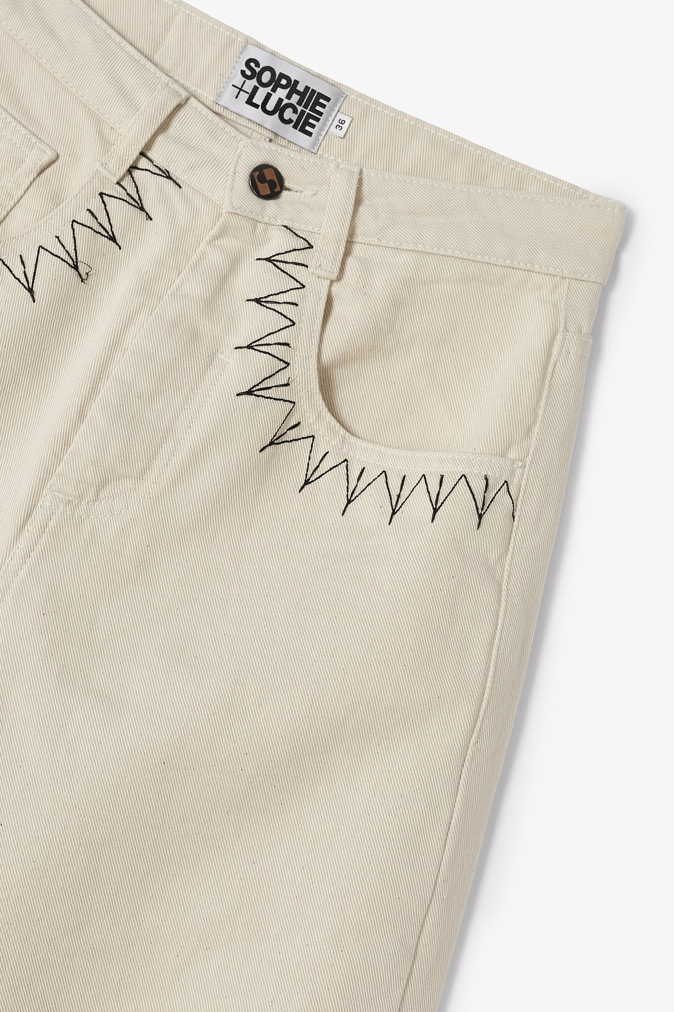 Vaquero de tiro alto crop tipo flare, confeccionado en tejido sarga 100% algodón en color crudo. Con fit entallado y acabado en el bajo con un ligero evasé. Cierre con cremallera y botón central. Detalle de bordado en los bolsillos delanteros.