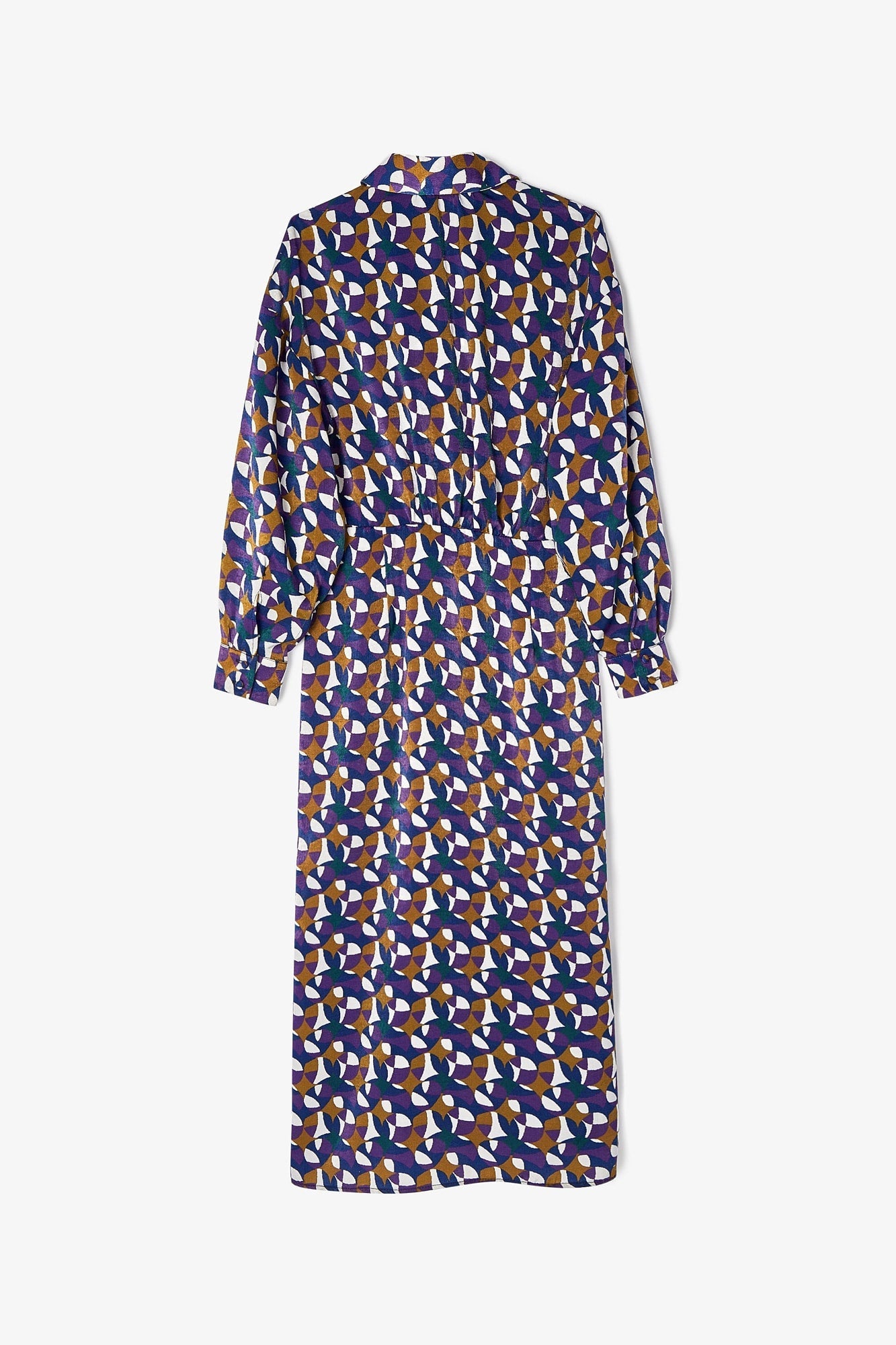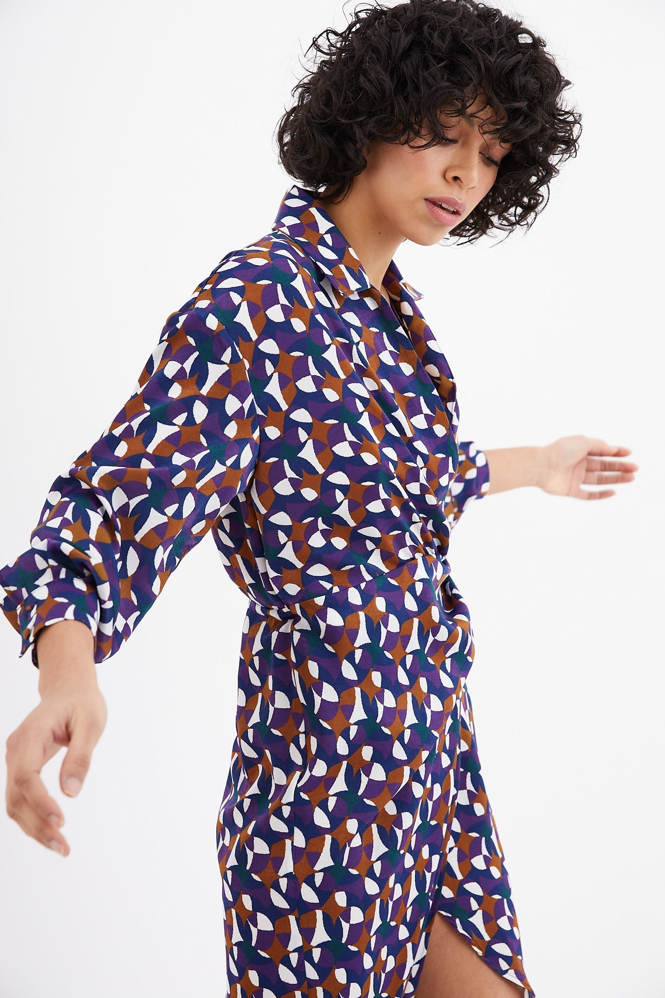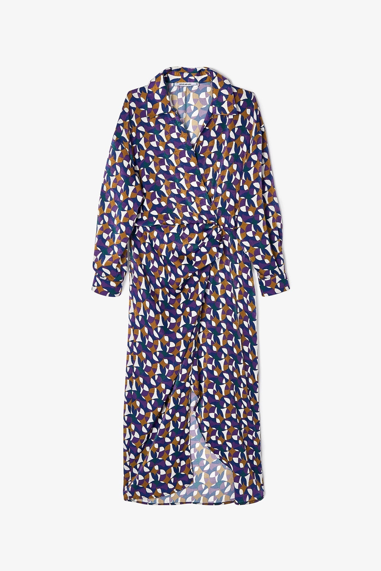 Vestido midi confeccionado en tejido estampado en tonos morados, con escote cruzado y cuello camisero. Manga larga terminada en puño con botonadura. Corte en la cintura y falda tipo envolvente con detalle de botones forrados laterales.