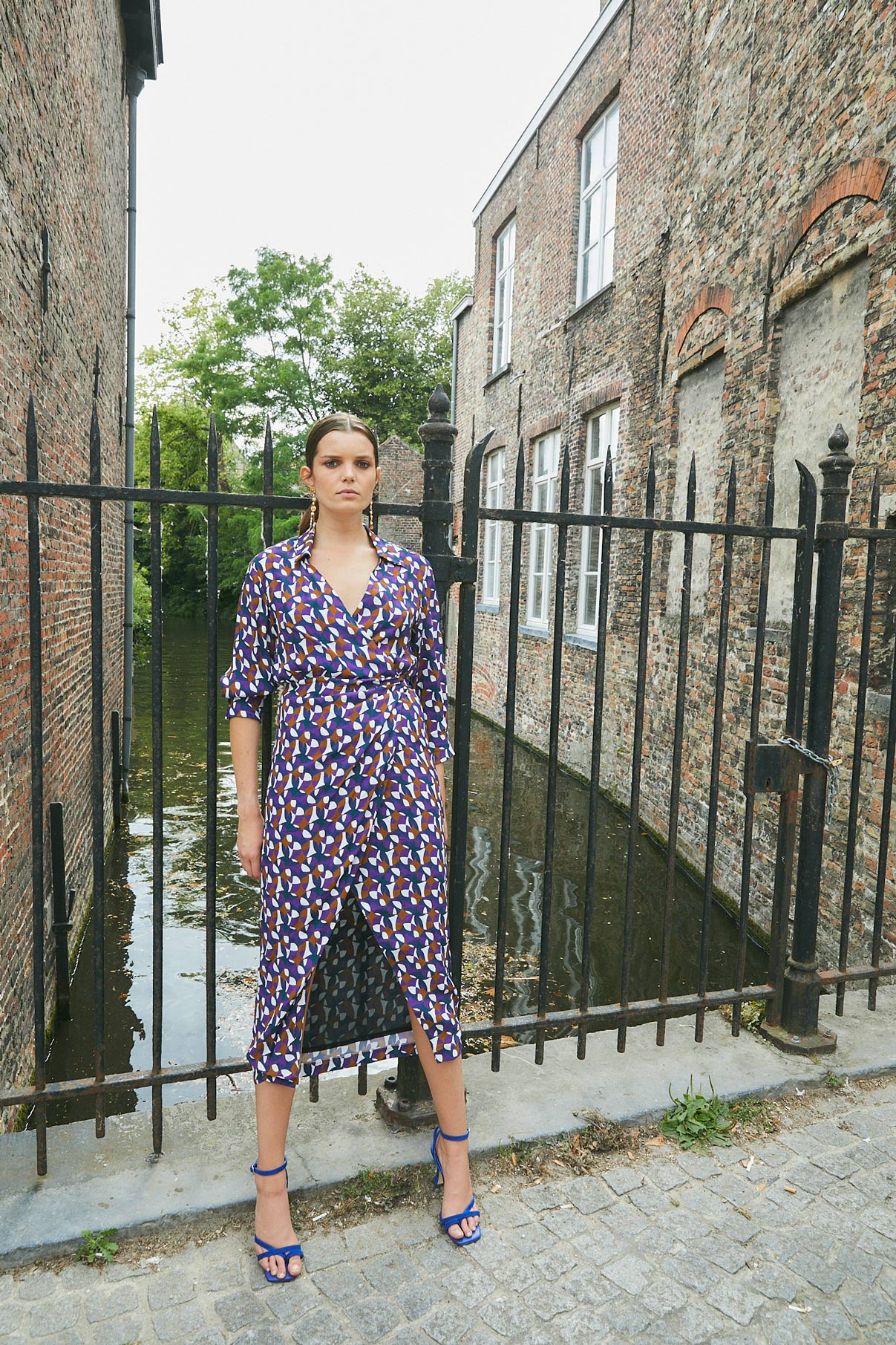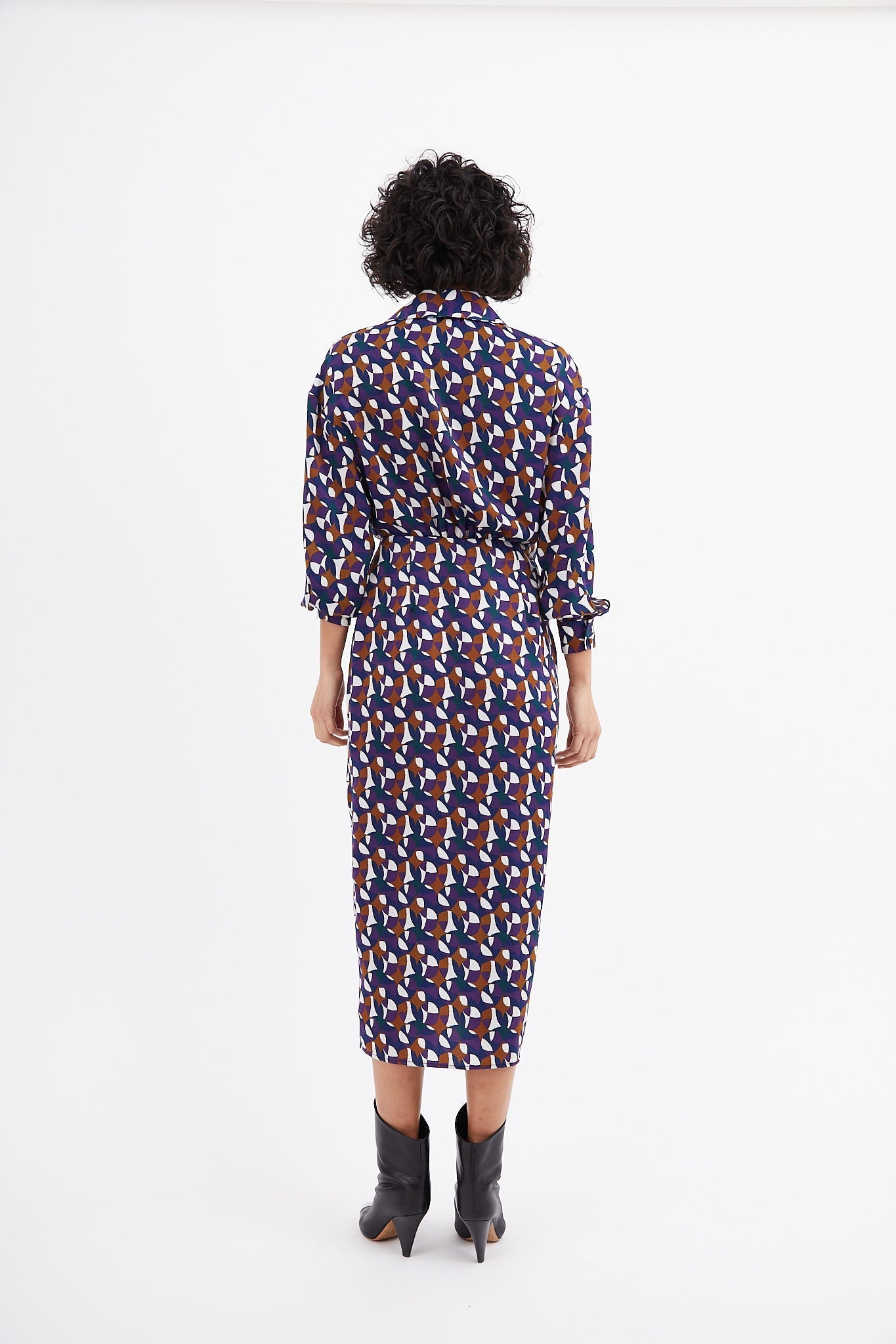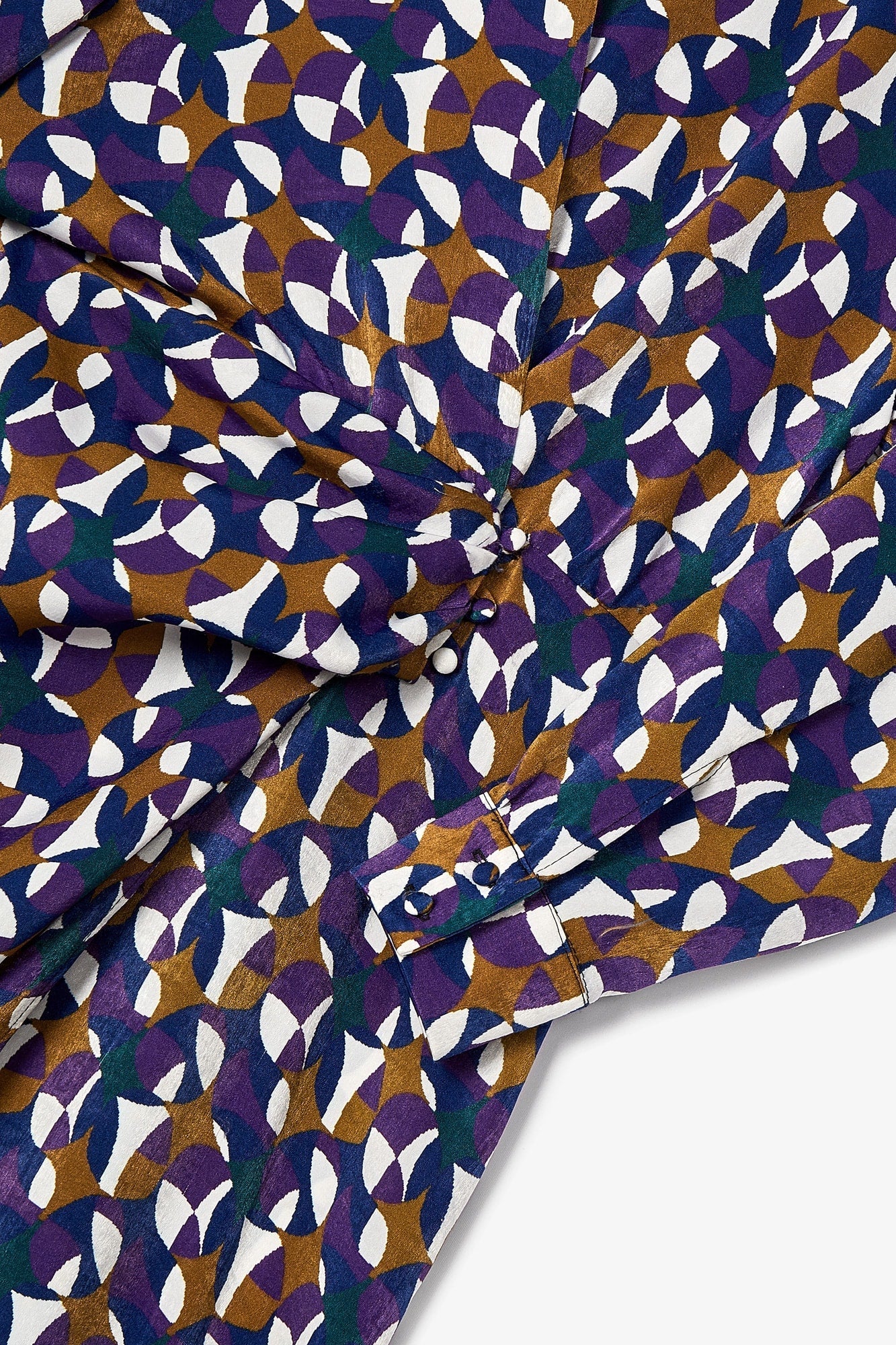 Vestido midi confeccionado en tejido estampado en tonos morados, con escote cruzado y cuello camisero. Manga larga terminada en puño con botonadura. Corte en la cintura y falda tipo envolvente con detalle de botones forrados laterales.