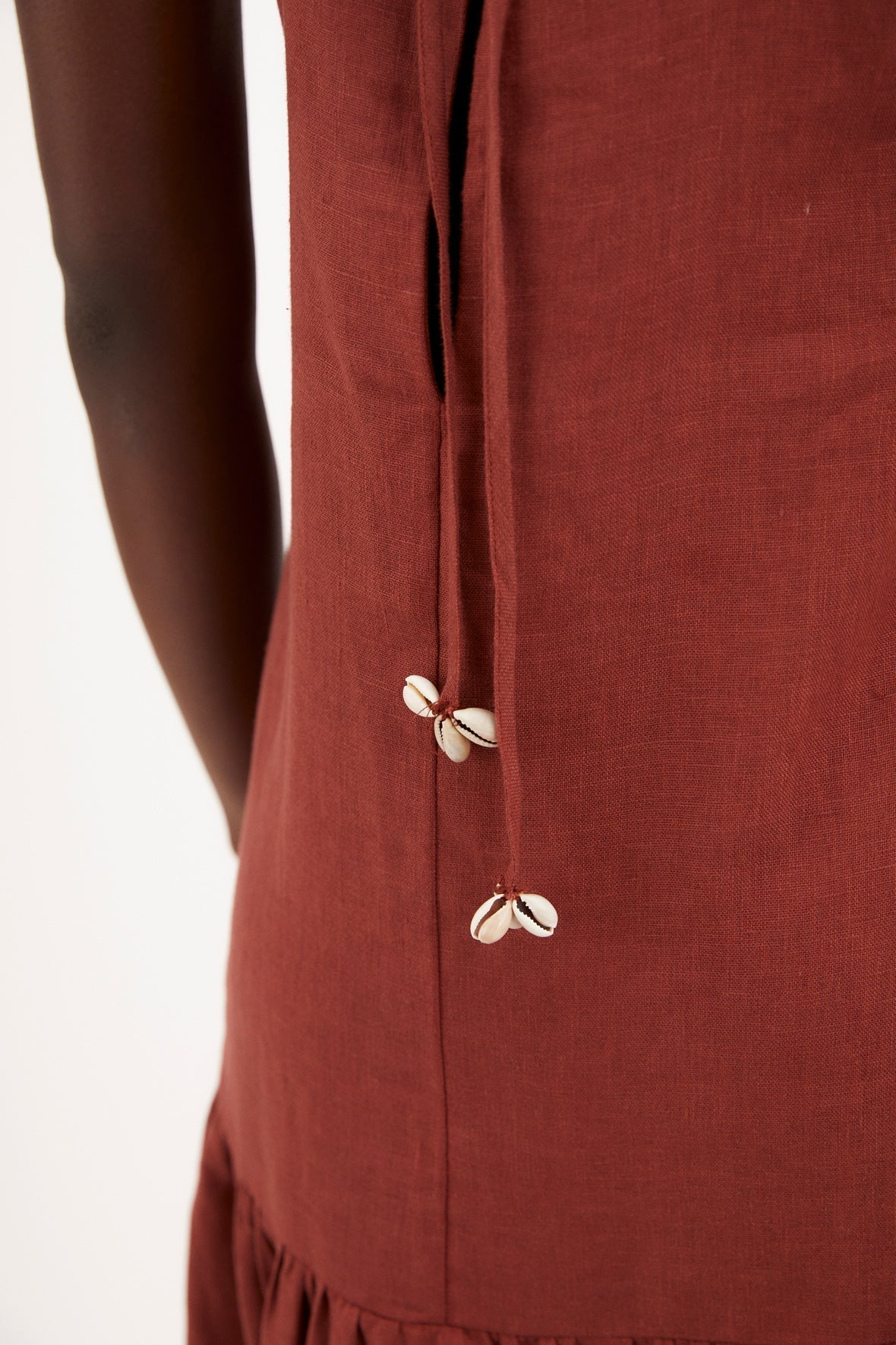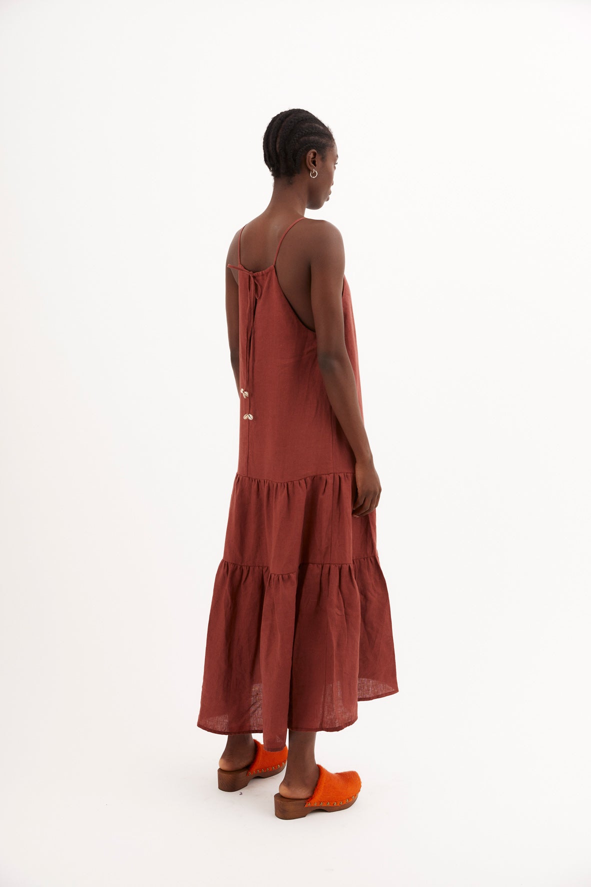 Vestido tobillero confeccionado en tejido de lino 100%. Escote cuadrado con tirantes terminados con detalle de conchas. Bajo acabado en paneles para dar vuelo a la falda.