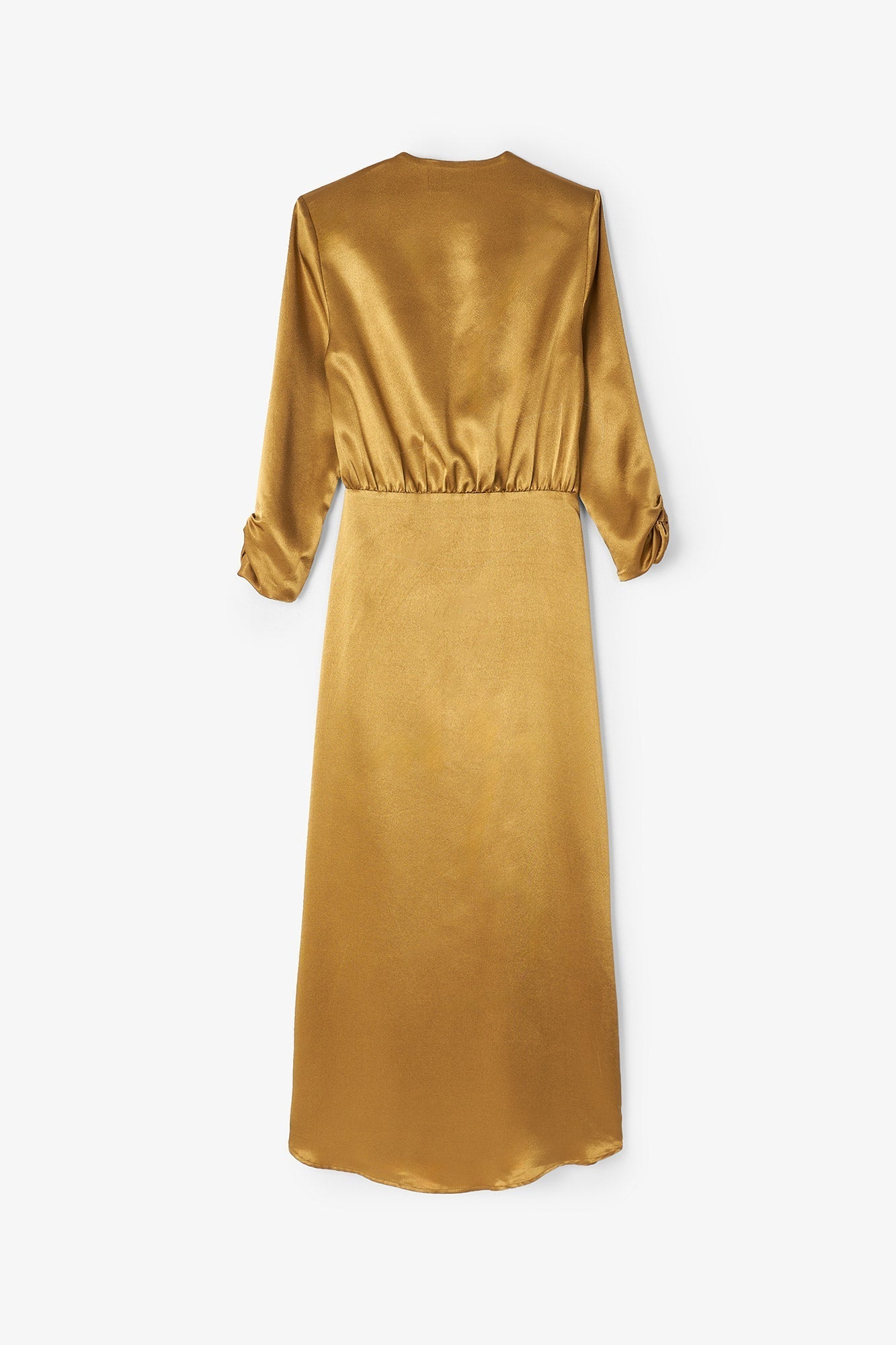 Vestido midi confeccionado en un tejido de viscosa en color ocre amarillo. Nuestro vestido Fernanda tiene manga tres cuartos y escote en pico. Se caracteriza por los detalles de fruncido en las mangas y la parte central del vestido para crear forma y soltura en la prenda. Cierre con cremallera invisible en el lateral.