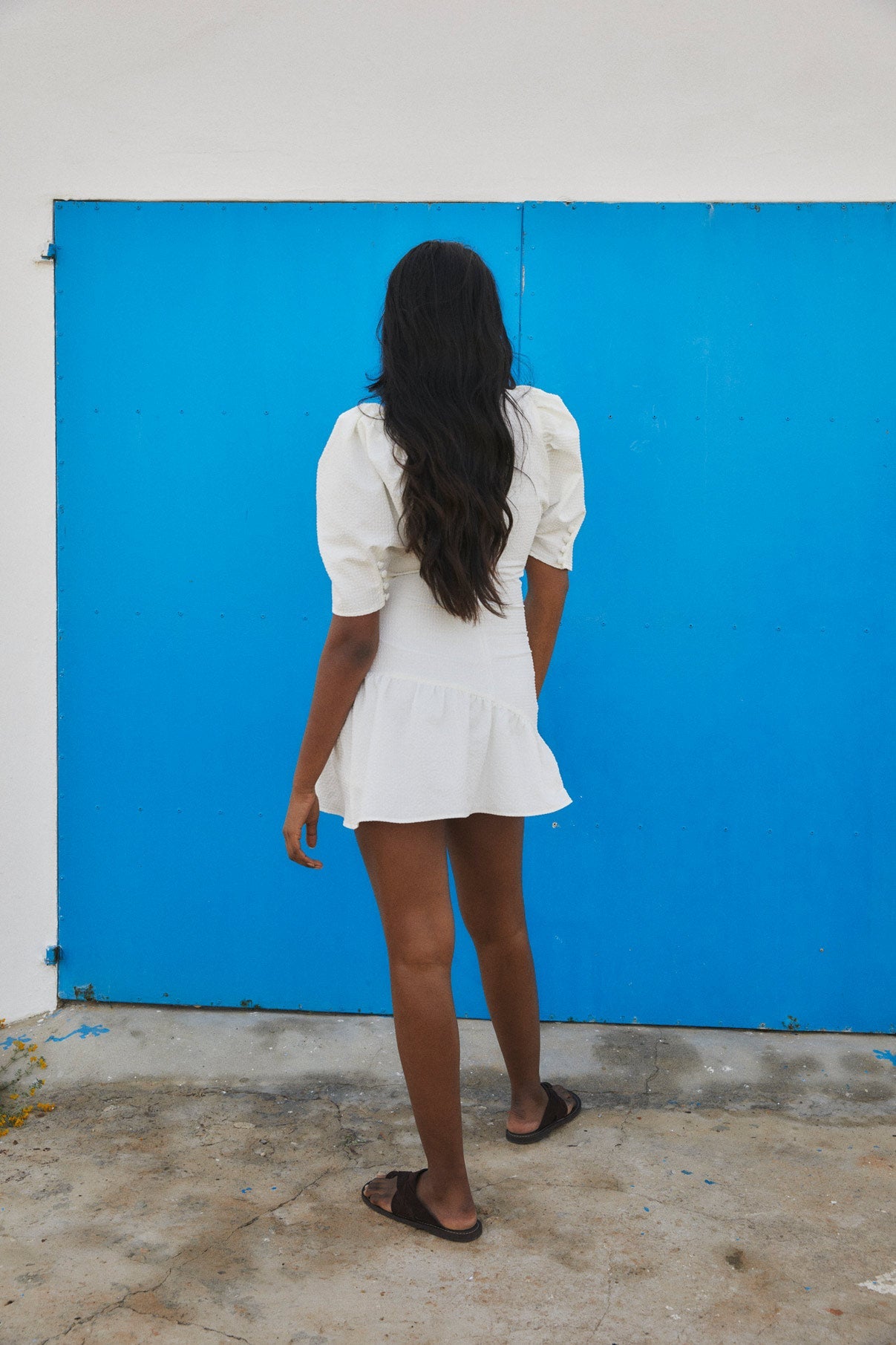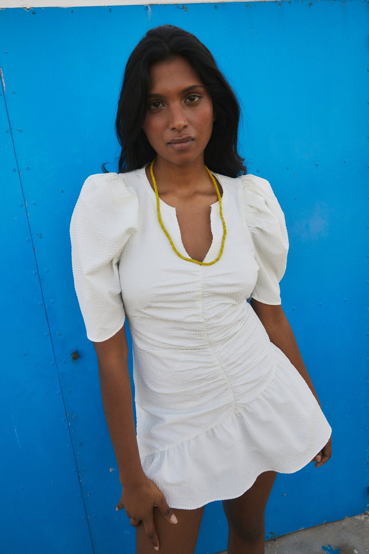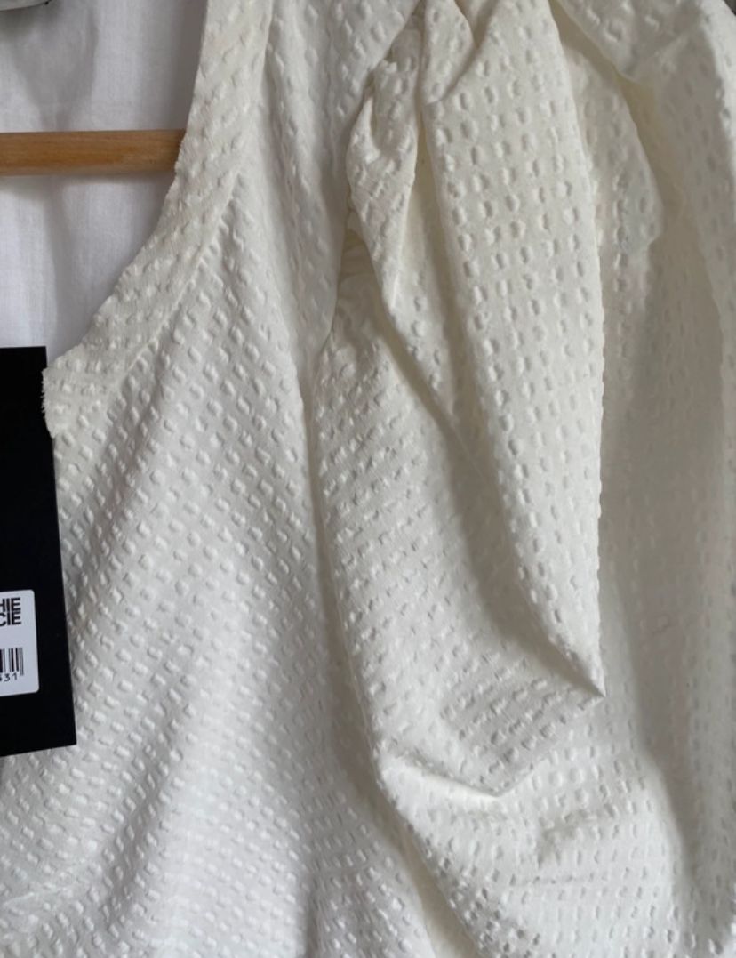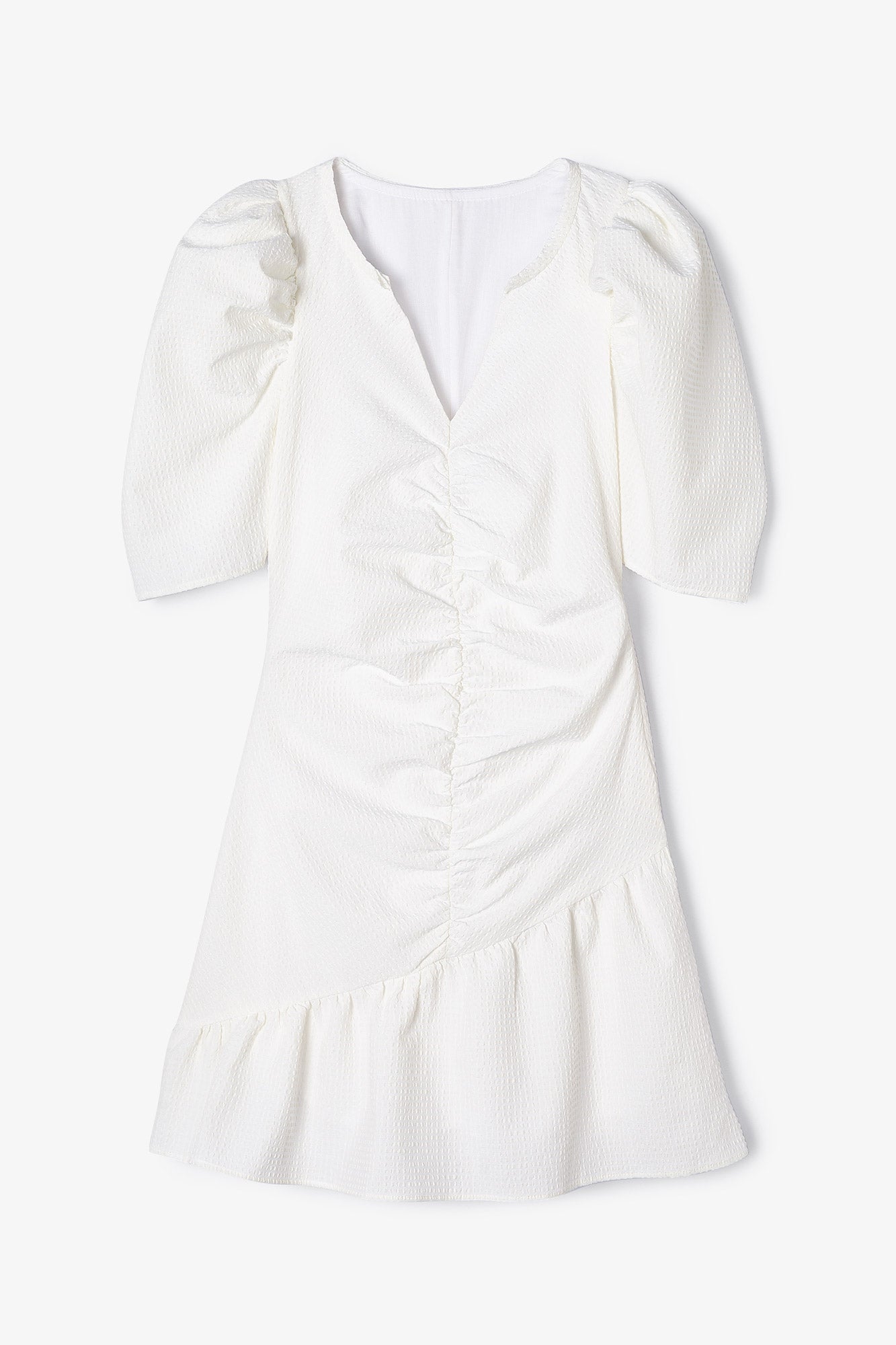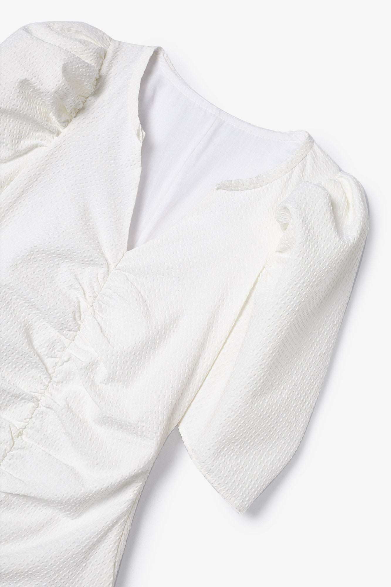 Vestido corto, confeccionado en un tejido cuadrille en color blanco. Escote en pico, ajustado mediante un detalle de elástico en el delantero, formando ligeros pliegues y drapeados. Terminación con un pequeño volante. Las mangas son con volumen, tipo manga farol. Cierre con cremallera invisible en el lado izquierdo.