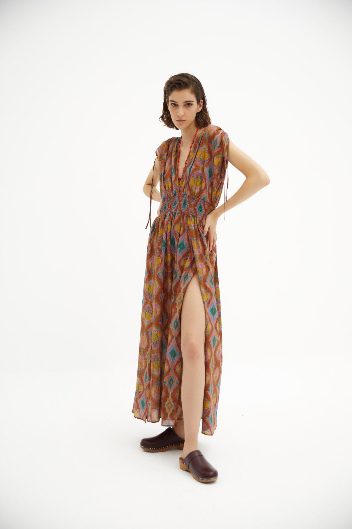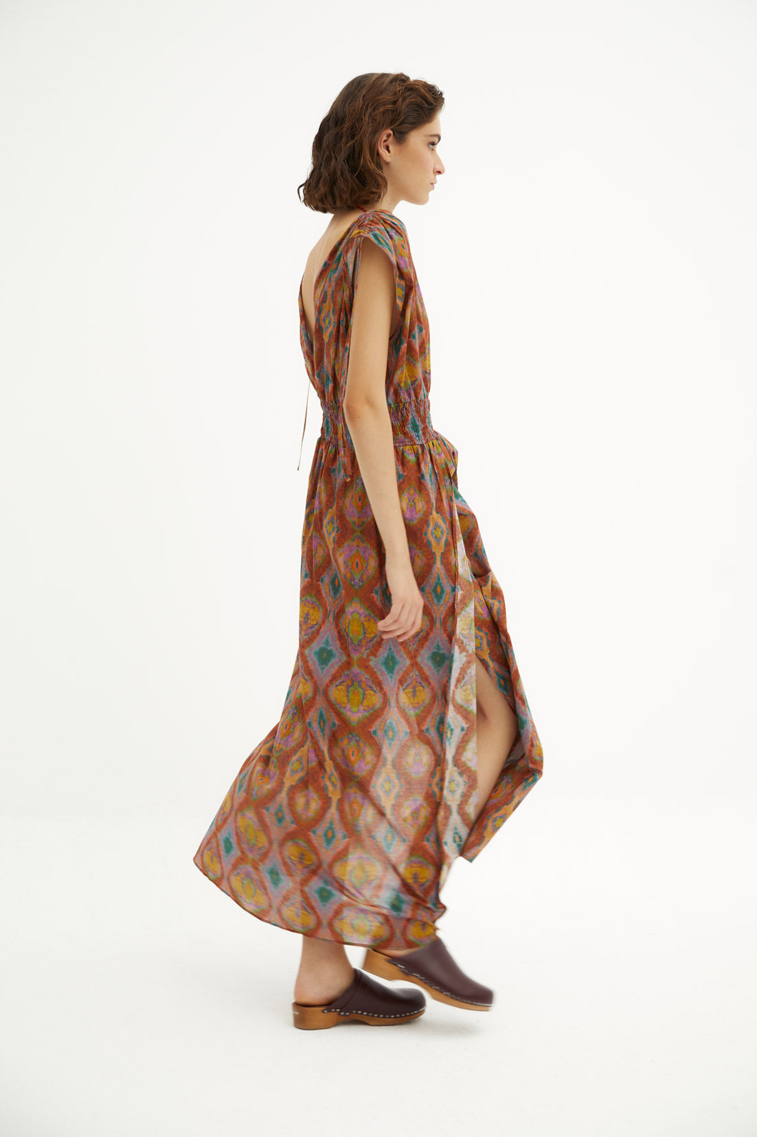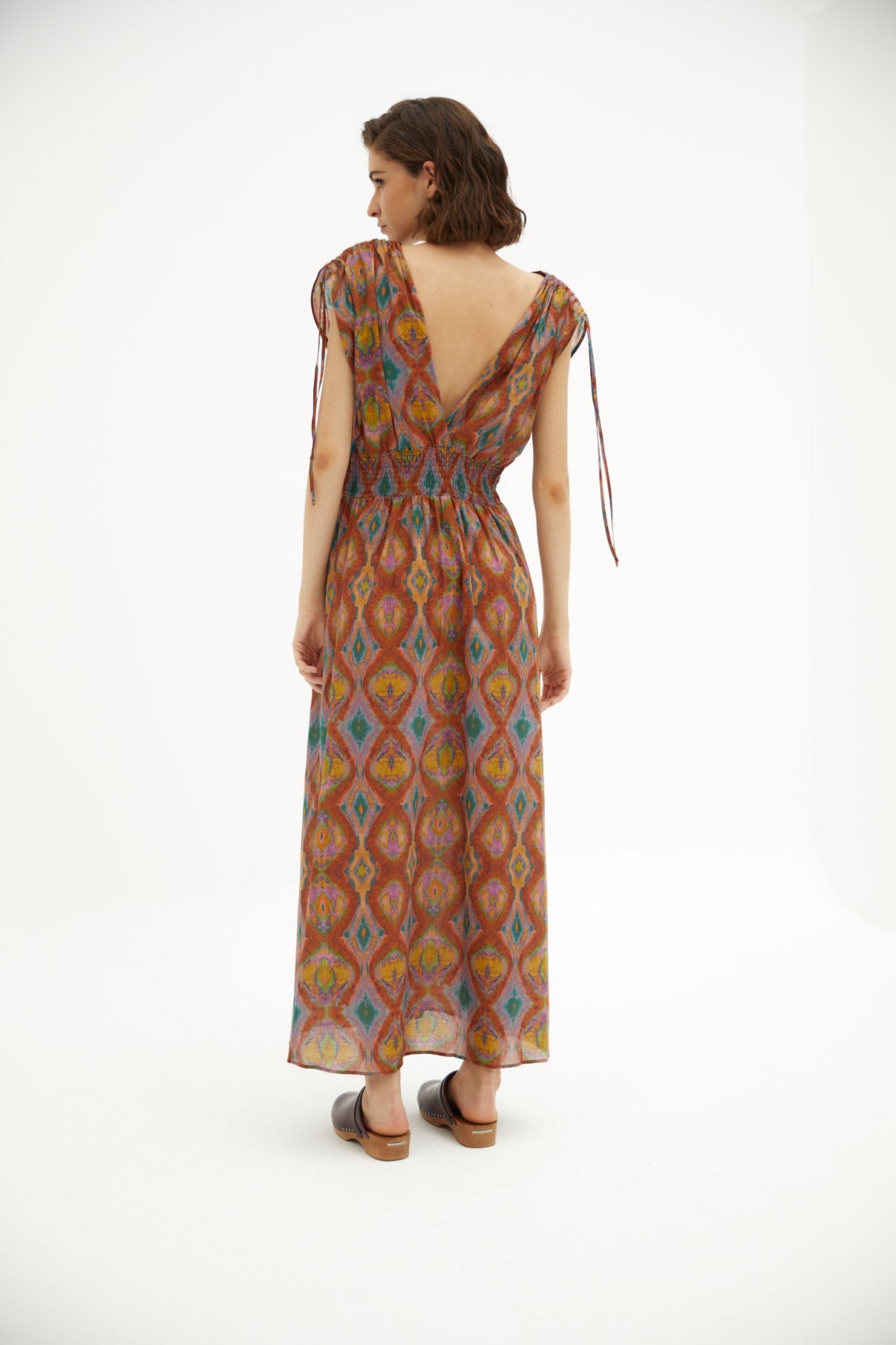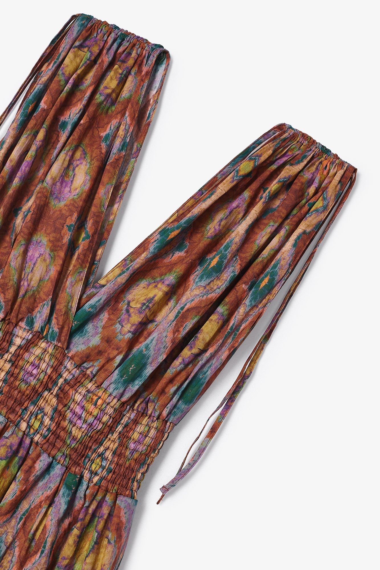 Vestido fluido midi, confeccionado en estampado tie dye en color teja. Vestido con escote en pico y tirante grueso fruncido en el hombro creando un efecto plisado, con lazadas para fruncirlo a la medida deseada. Cinturilla efecto nido de abeja con elástico. Falda con evasé y un ligero vuelo.