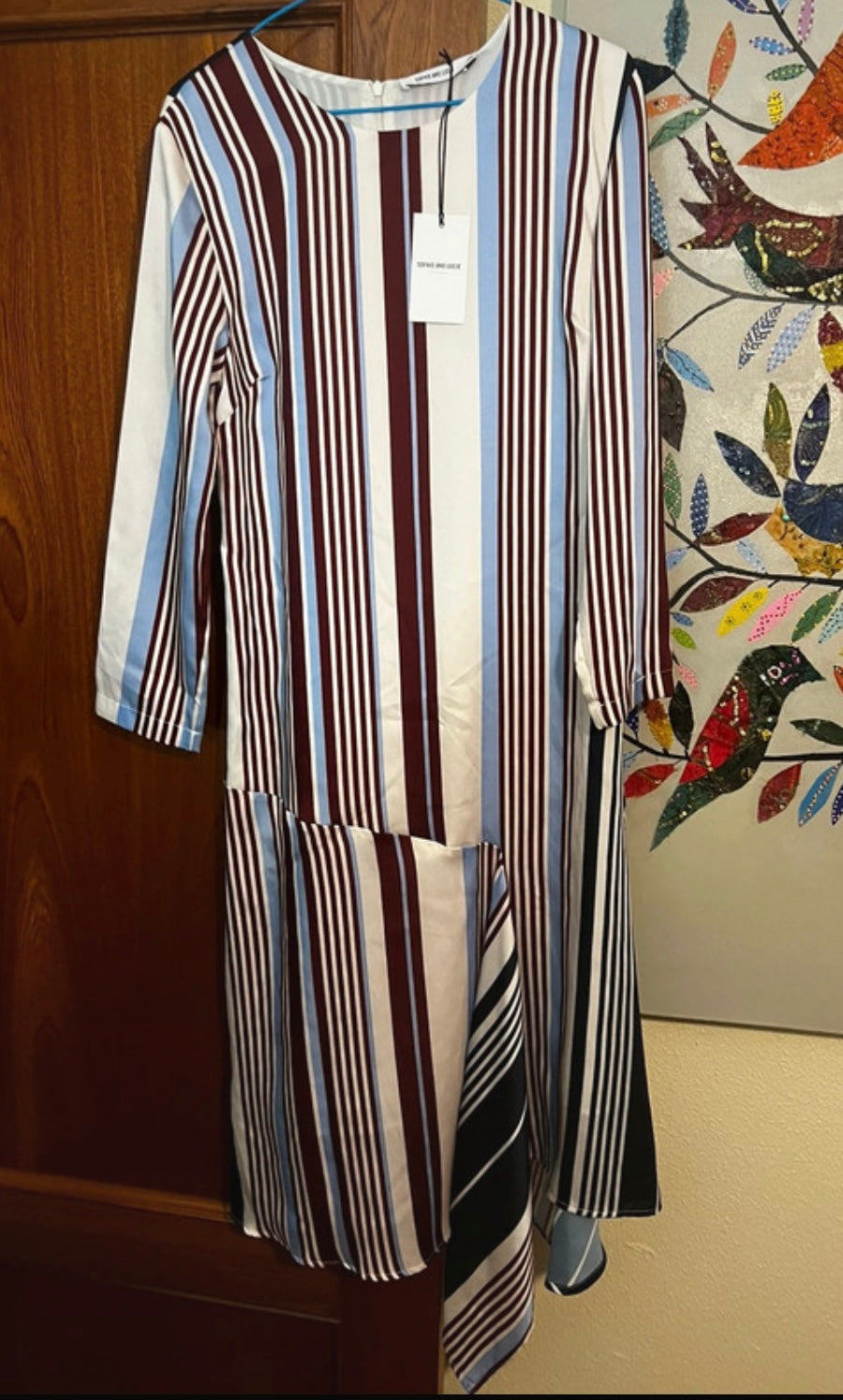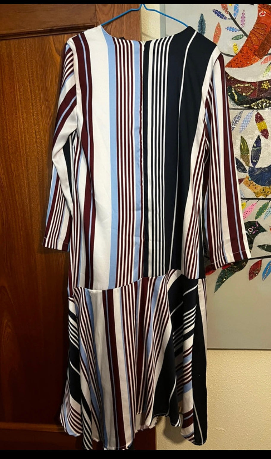 Vestido midi confeccionado en twill estampado. Escote redondo, manga larga , el bajo es asimetrico.
