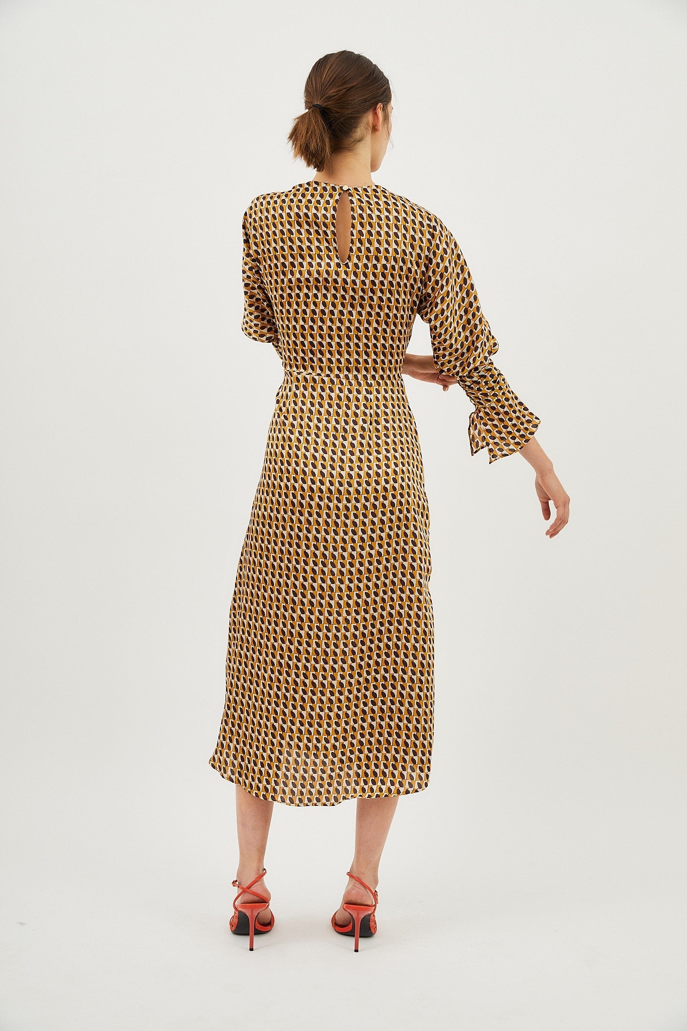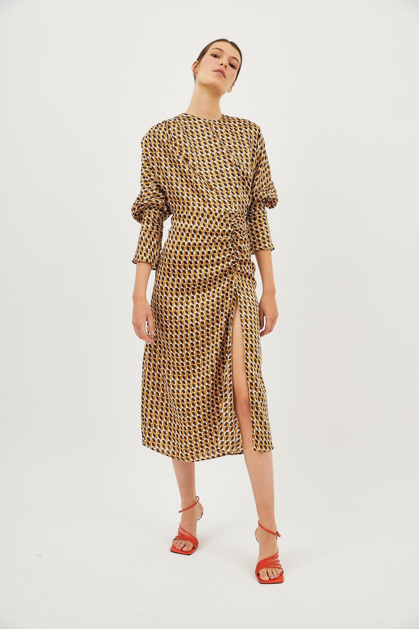 Vestido midi confeccionado en tejido estampado en tonos marrones. Vestido con escote caja. Manga larga con volumen terminada en un puño con volante abotonado. Falda con detalle de frunce y abertura lateral para dar movimiento.