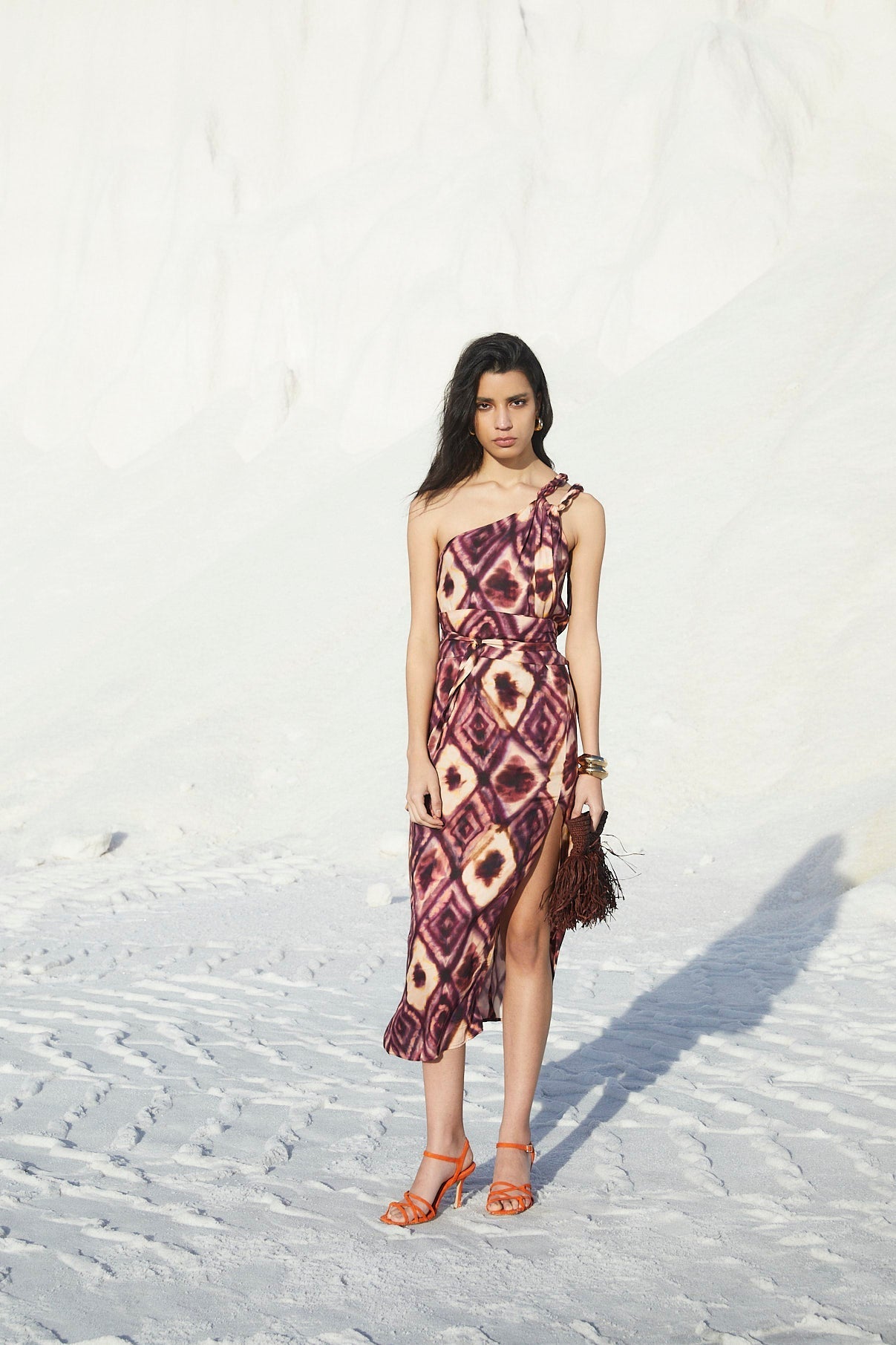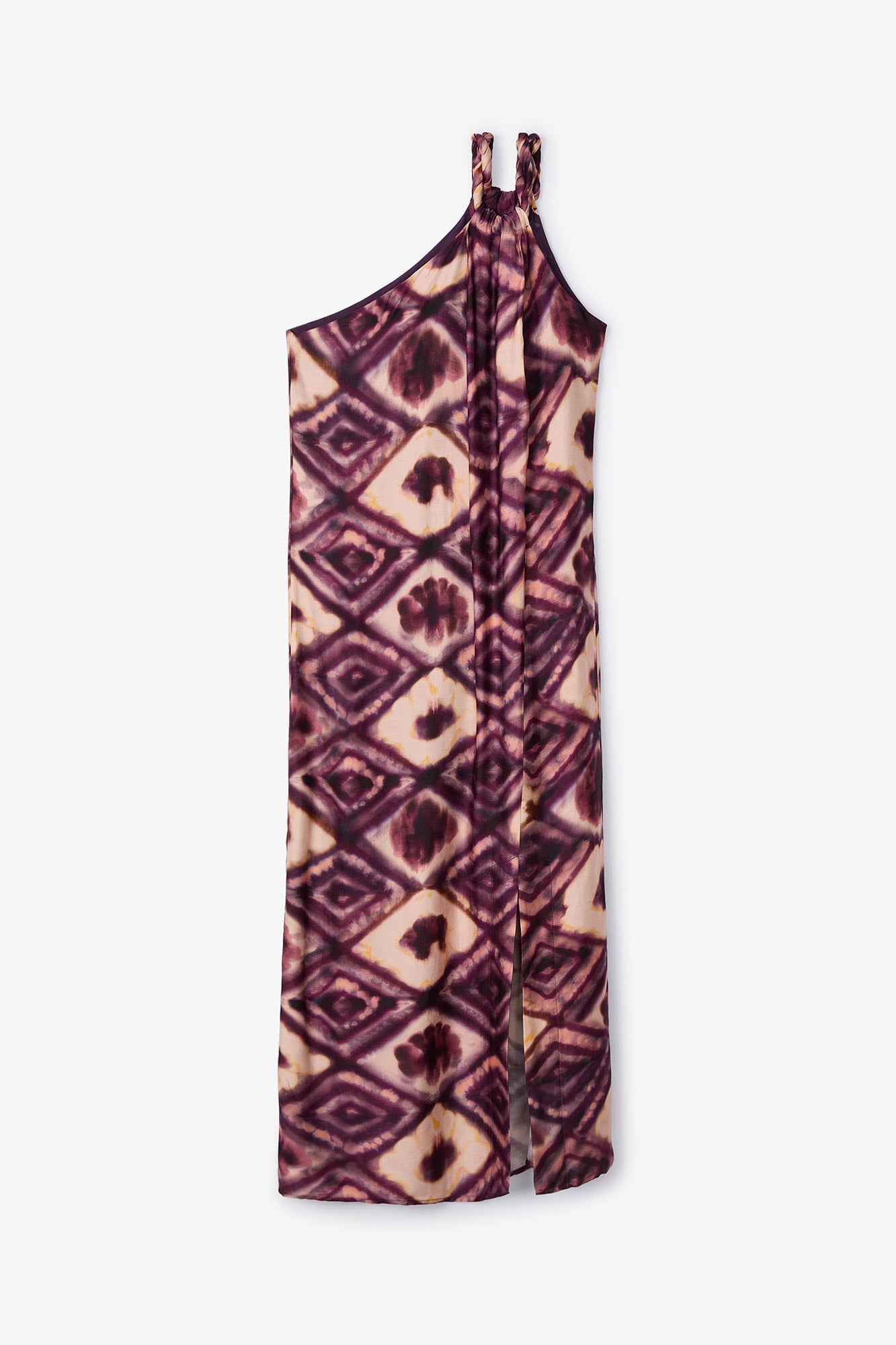 El vestido Paola, con corte midi y un tejido fluido. Tiras trenzadas en solo un hombro creando un cuello asimétrico. Sin mangas. Abertura lateral. Cierre en el lateral con cremallera invisible.