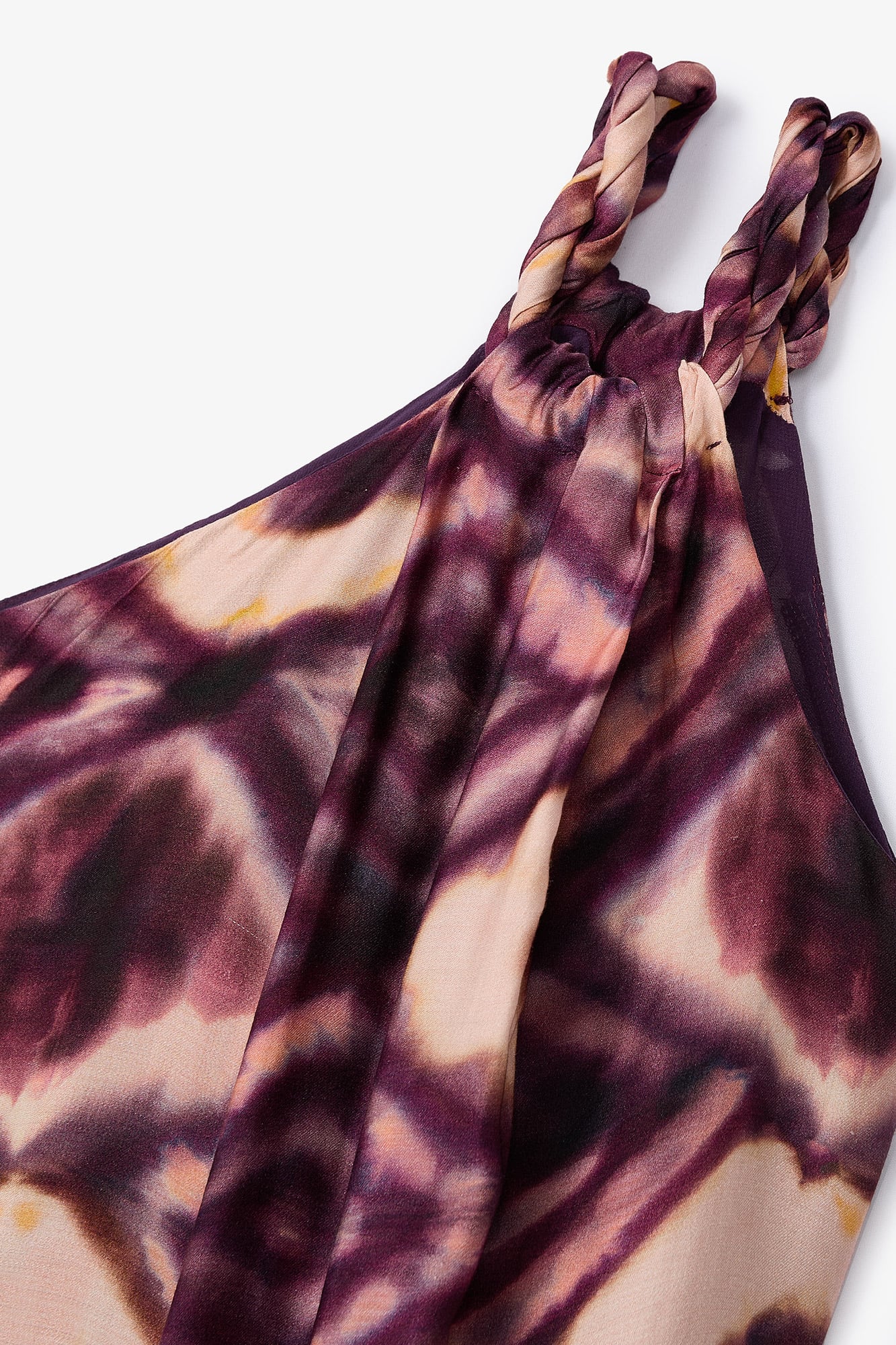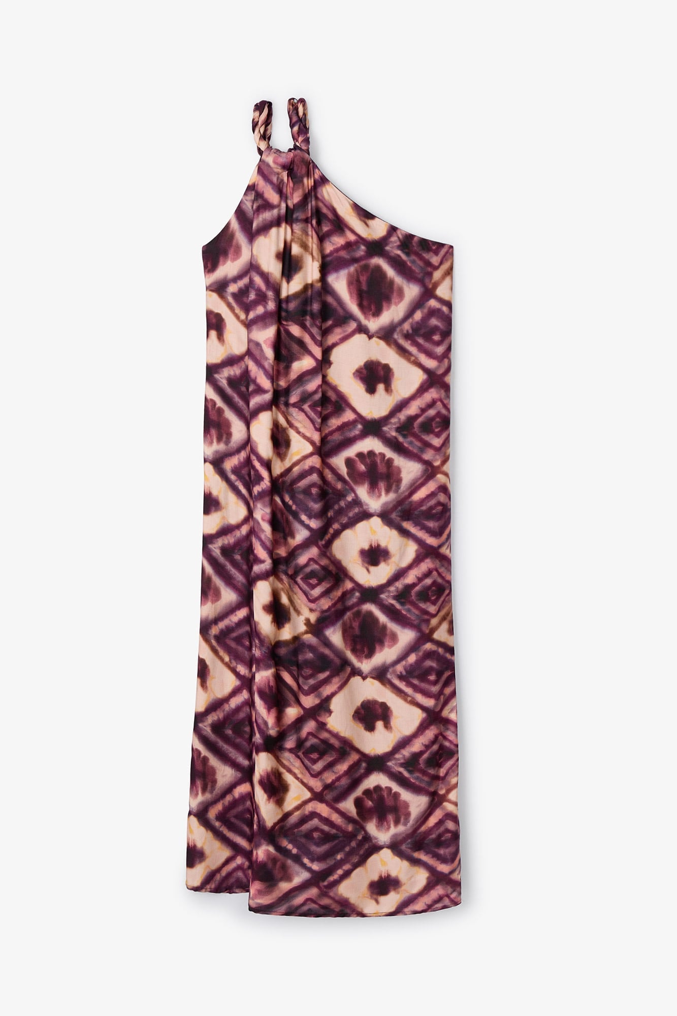 El vestido Paola, con corte midi y un tejido fluido. Tiras trenzadas en solo un hombro creando un cuello asimétrico. Sin mangas. Abertura lateral. Cierre en el lateral con cremallera invisible.