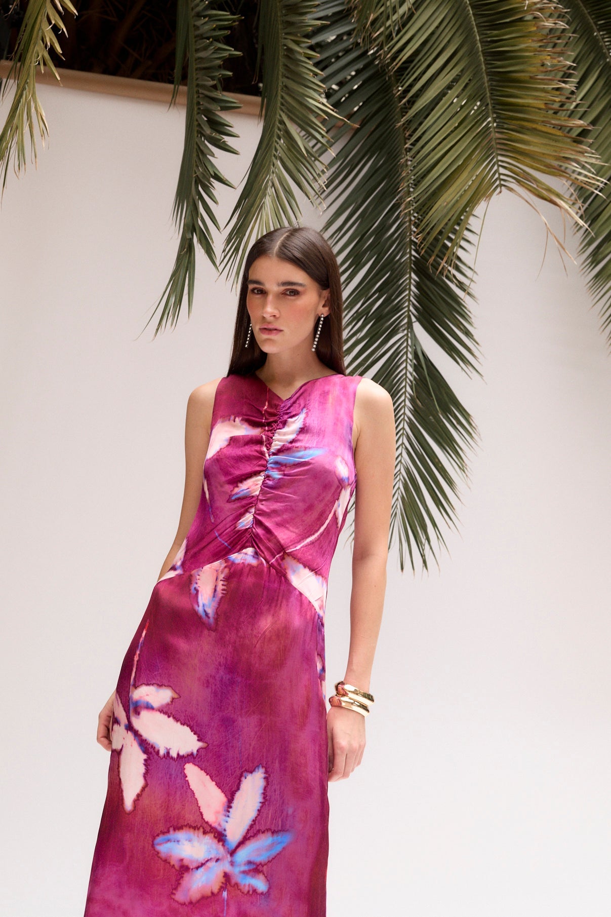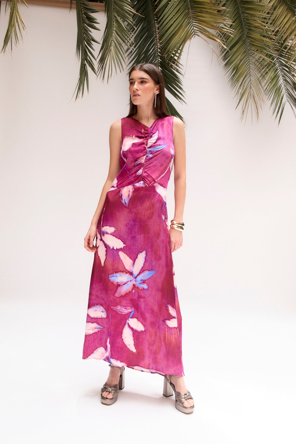 Vestido midi confeccionado en un tejido satinado estampado de flores. Ligero escote en pico. Sin manga. Detalle de fruncido en el frontal que permite que la prenda tenga un ligero vuelo.