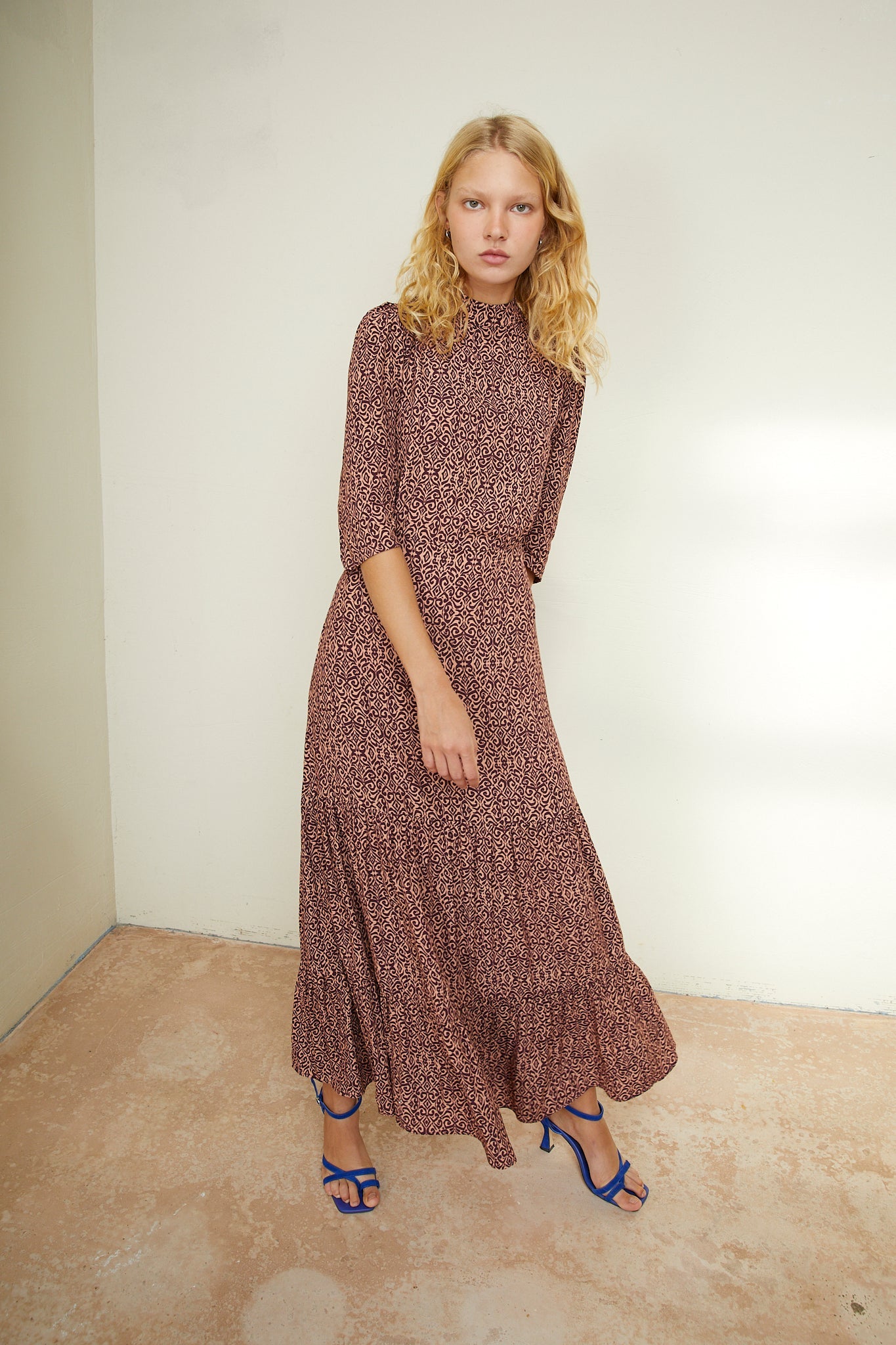 Vestido midi con cuello chimenea y manga tres cuartos. Falda de paneles para aportar volumen y movimiento y detalle de abertura en la espalda con cierre de botones.