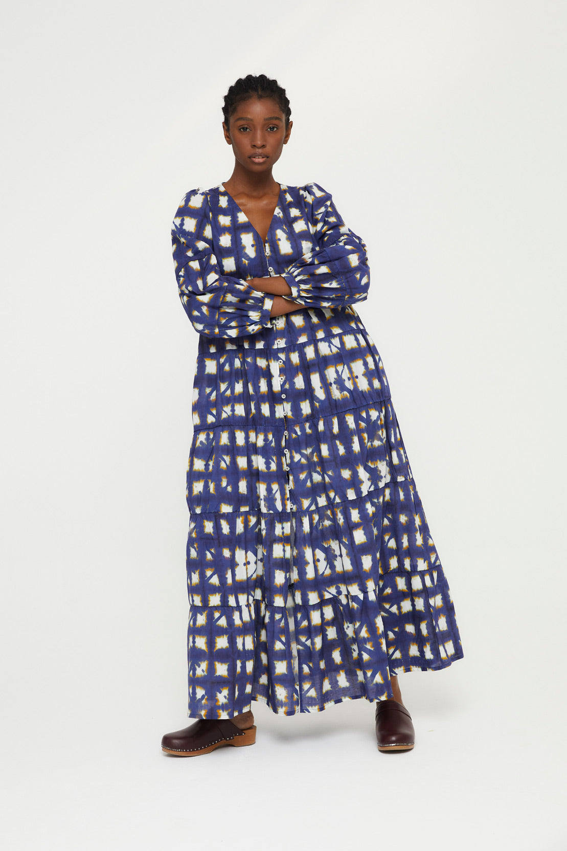 Vestido largo fluido, confeccionado en un tejido estampado batik color azul. Vestido de manga larga y escote en pico. Se cierra con botones en el delantero para llevarlo cerrado como vestido o también abierto como kaftan.