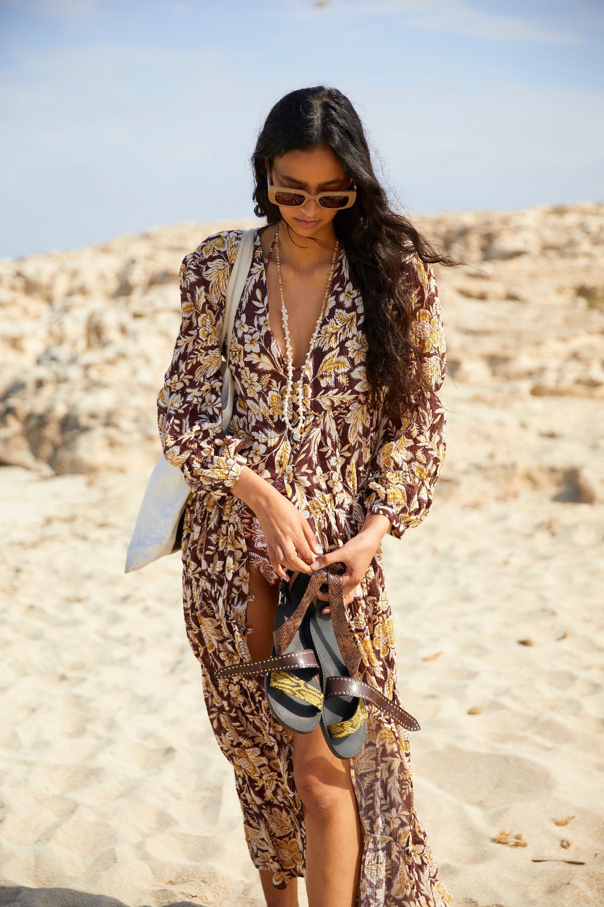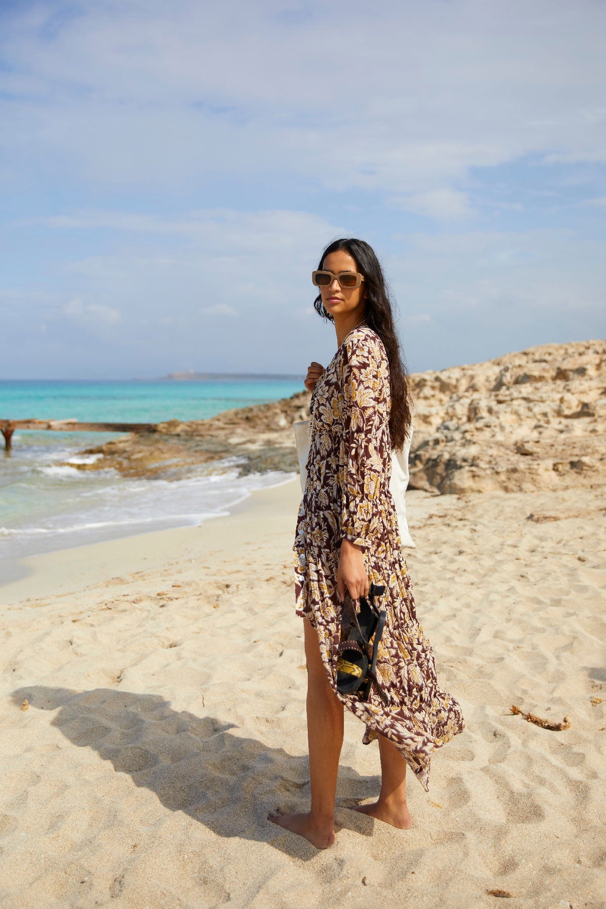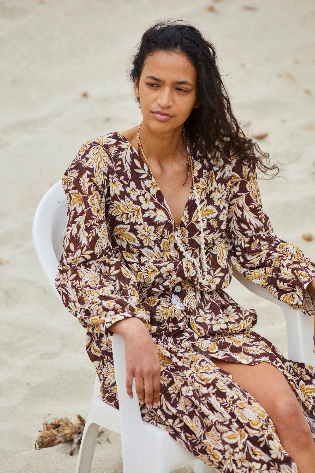 El vestido savina esta confeccionado en voile de algodon 100% estampado, tiene manga larga y es tobillero , se cierra con botones en el delantero para llevarlo cerrado como vestido o abierto como kaftan. Es ese vestido que te salva todas las situaciones del verano.