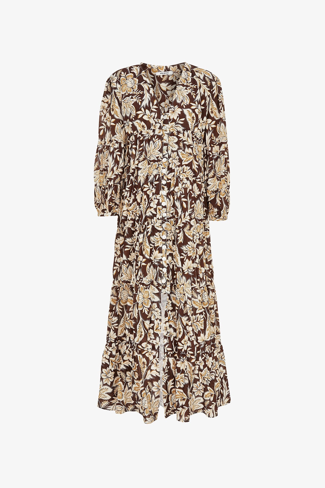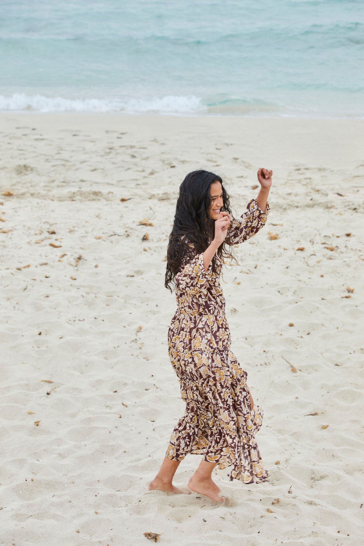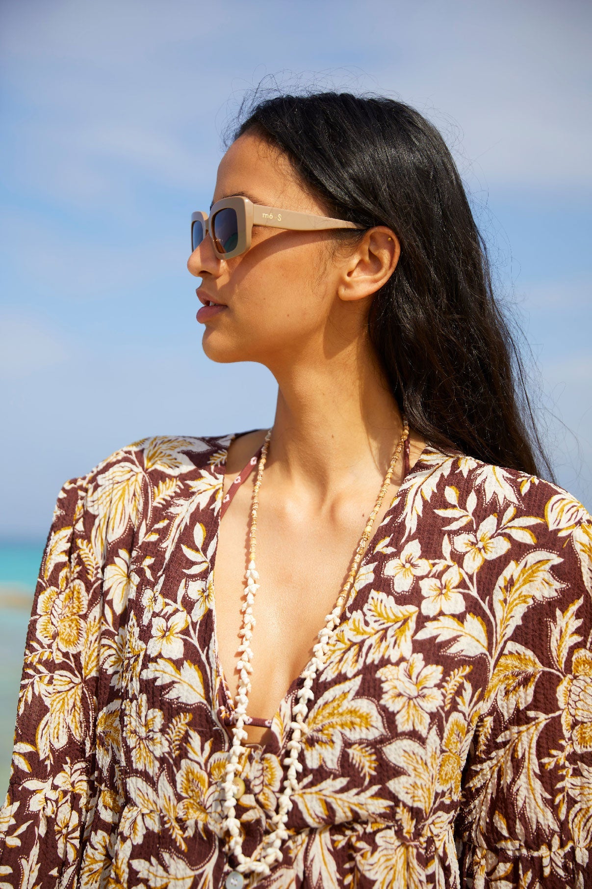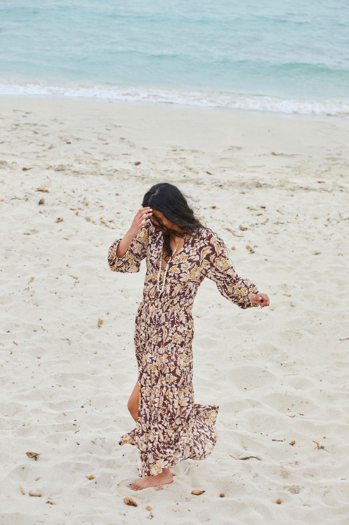 El vestido savina esta confeccionado en voile de algodon 100% estampado, tiene manga larga y es tobillero , se cierra con botones en el delantero para llevarlo cerrado como vestido o abierto como kaftan. Es ese vestido que te salva todas las situaciones del verano.