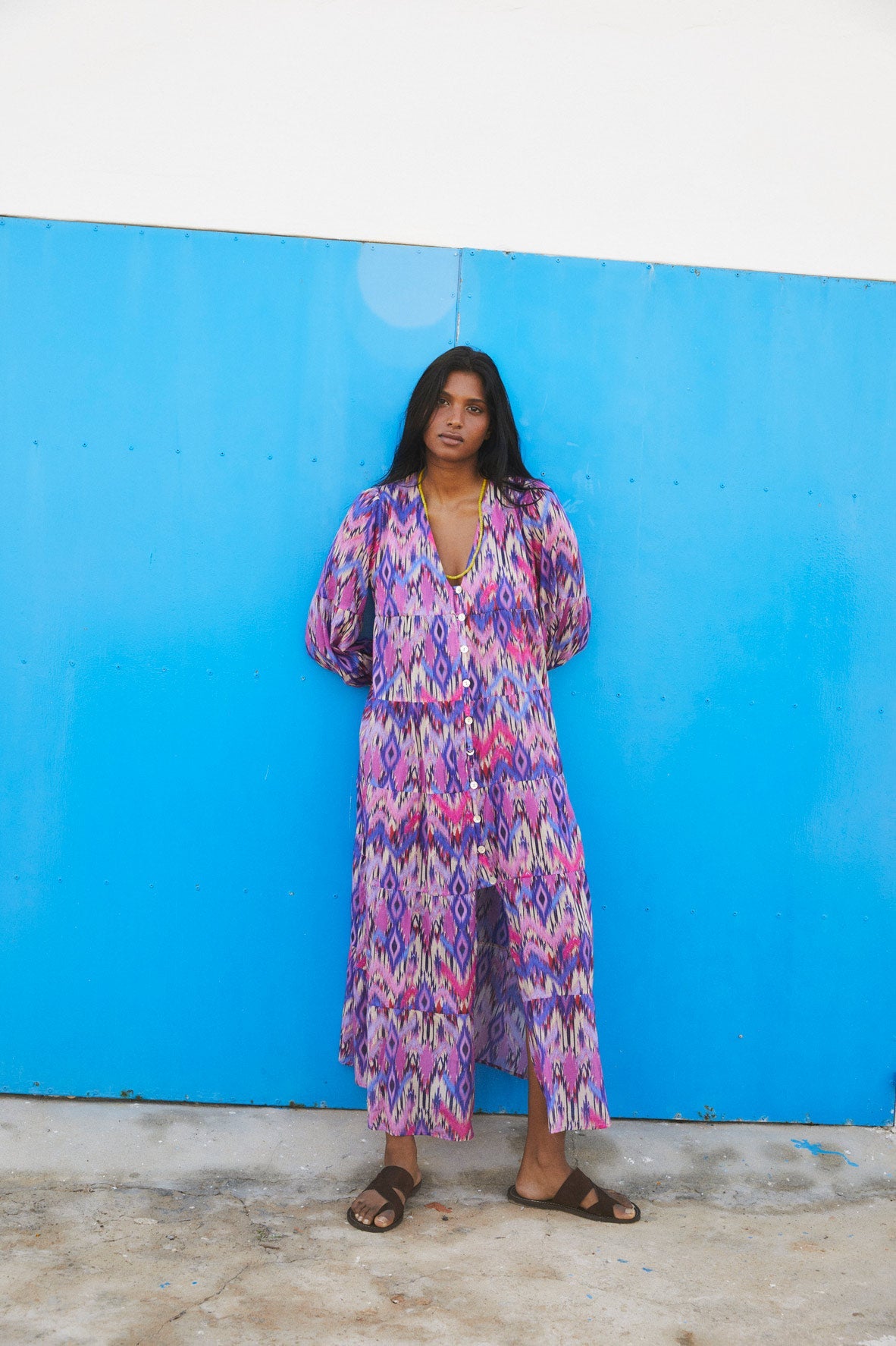 Vestido largo fluido, confeccionado en un tejido estampado en color fucsia. Vestido de manga larga y escote en pico. Se cierra con botones en el delantero para llevarlo cerrado como vestido o también abierto como kaftan.