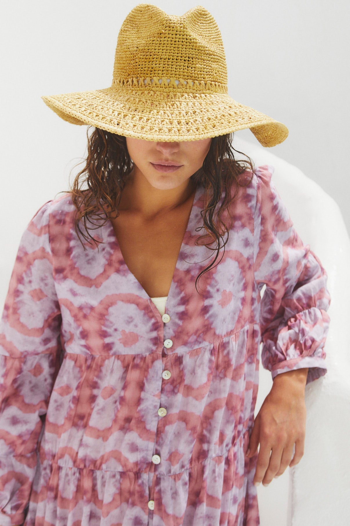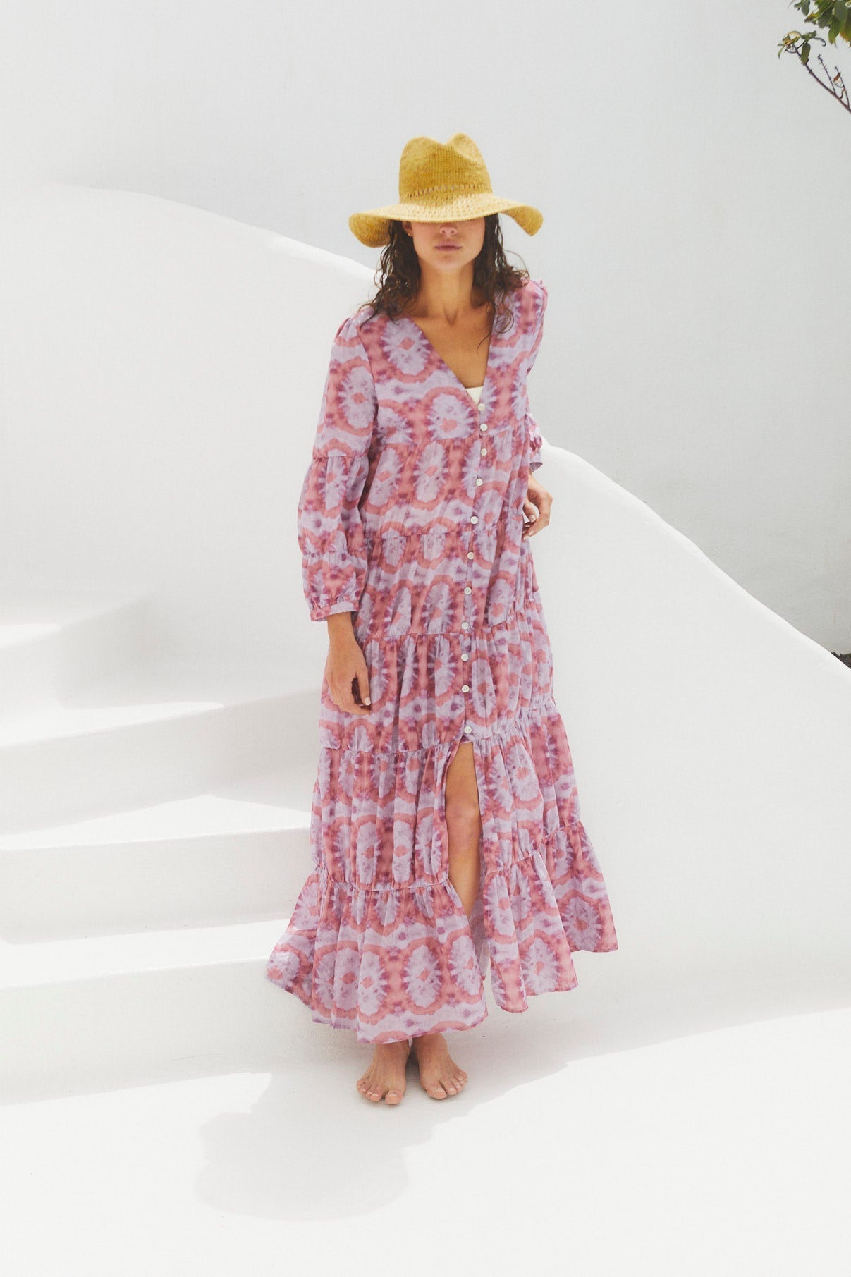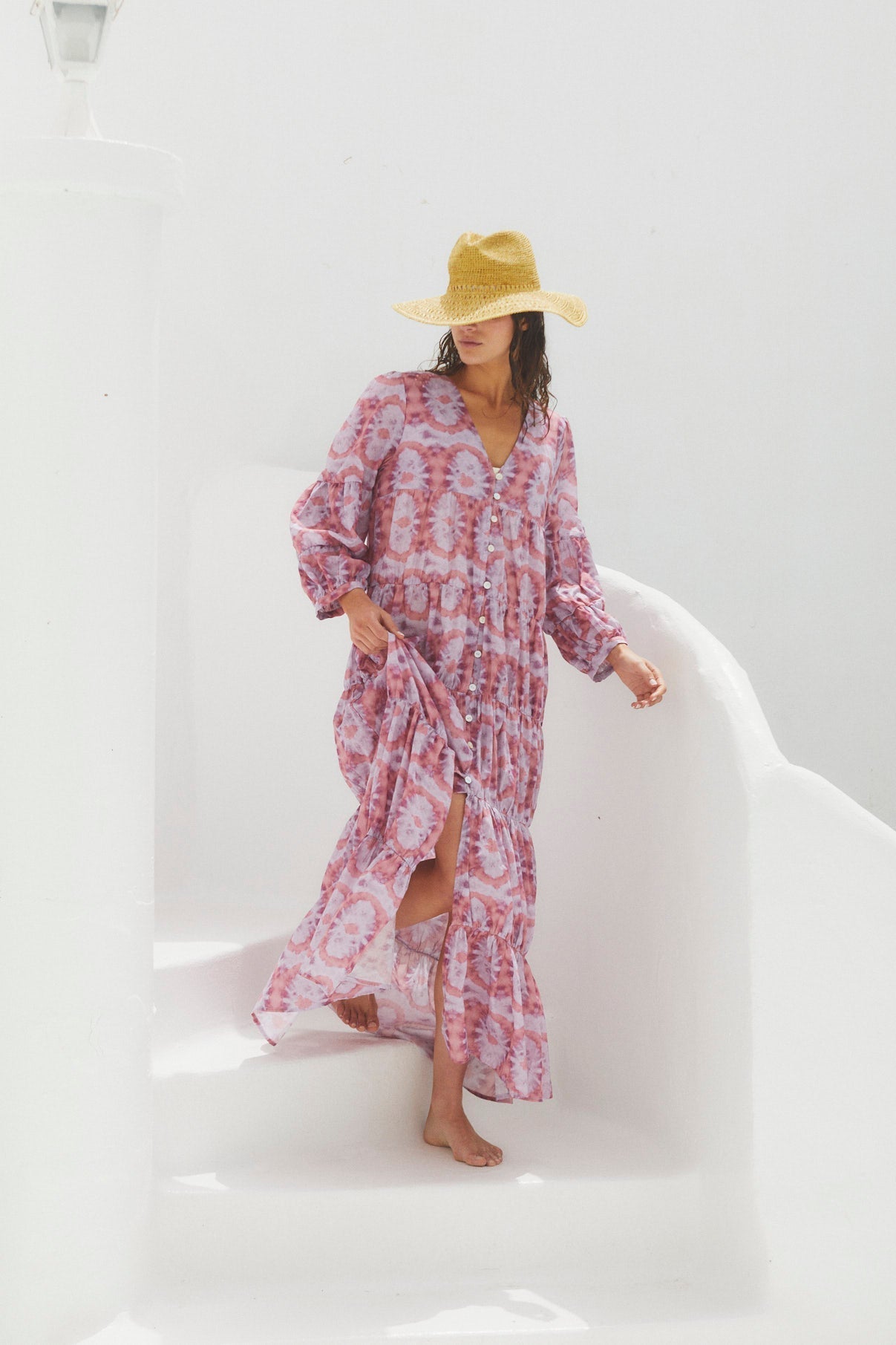 Vestido largo fluido, confeccionado en un tejido estampado tie dye color morado. Vestido de manga larga y escote en pico. Se cierra con botones en el delantero para llevarlo cerrado como vestido o también abierto como kaftan.