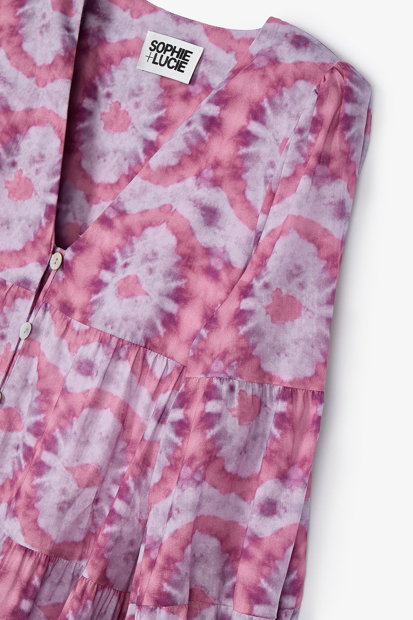 Vestido largo fluido, confeccionado en un tejido estampado tie dye color morado. Vestido de manga larga y escote en pico. Se cierra con botones en el delantero para llevarlo cerrado como vestido o también abierto como kaftan.