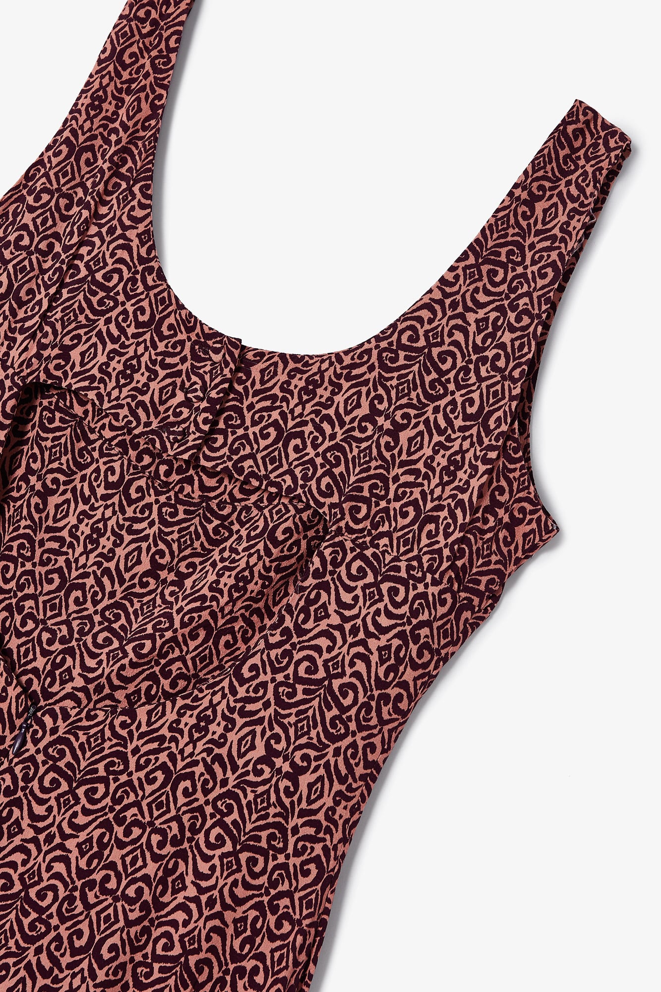 Vestido midi de tirantes confeccionado en tejido estampado. Falda con fit evasé y detalle de abertura en la espalda con cierre superior de botones.