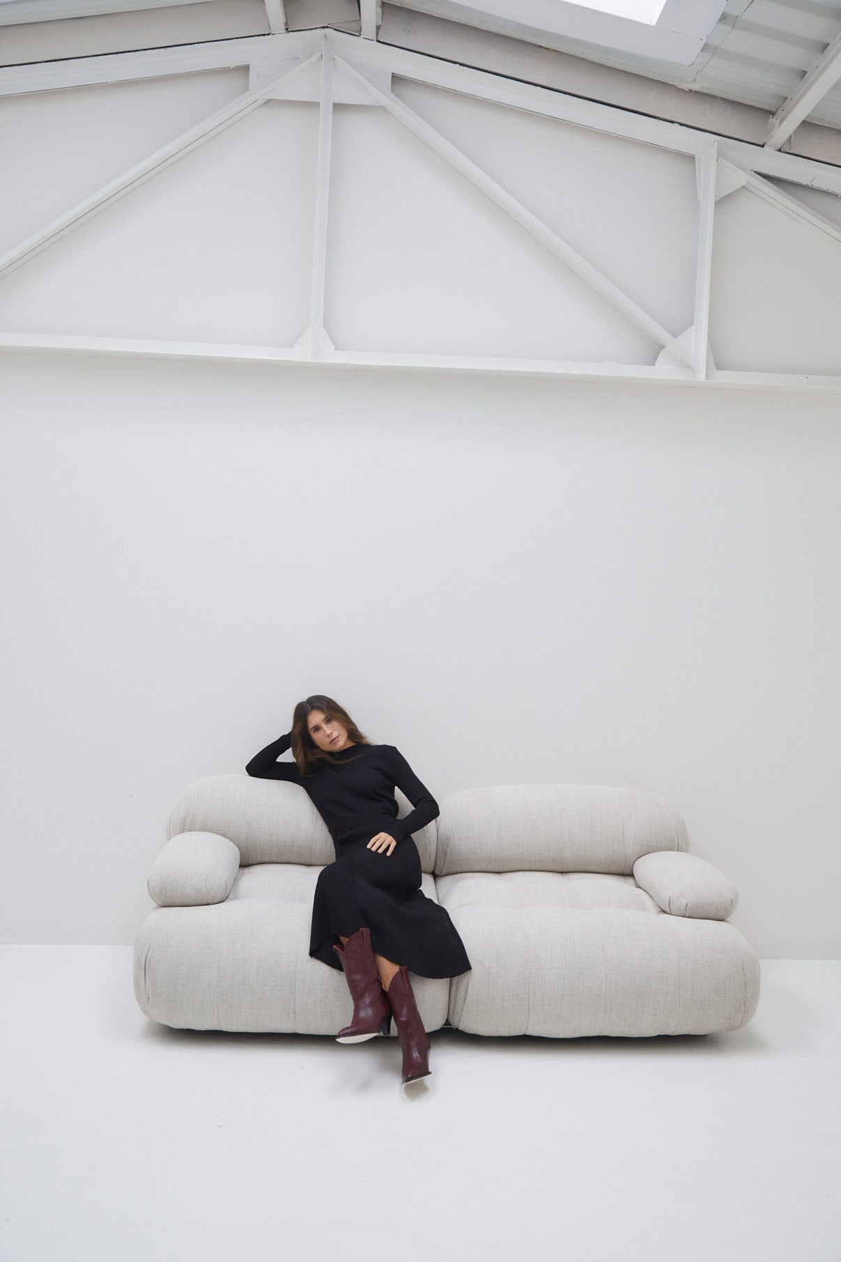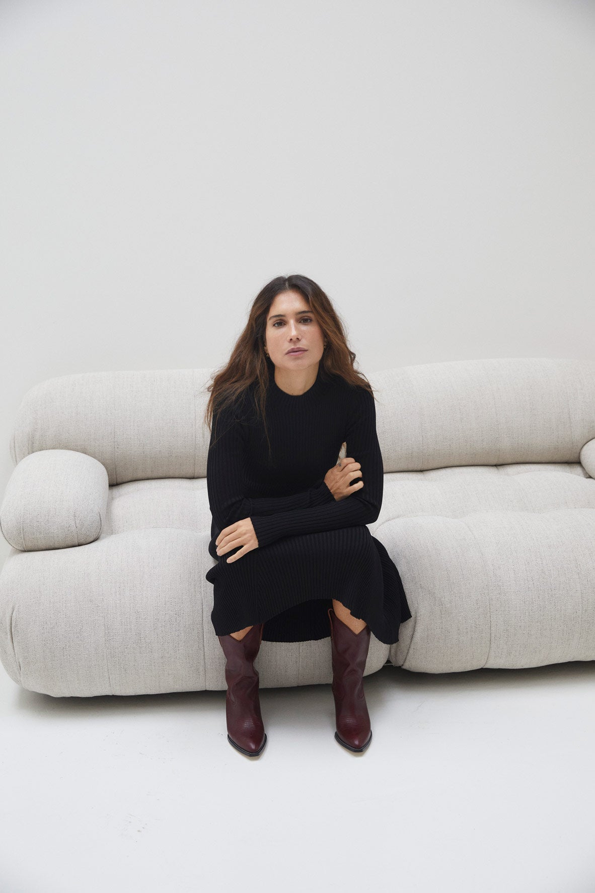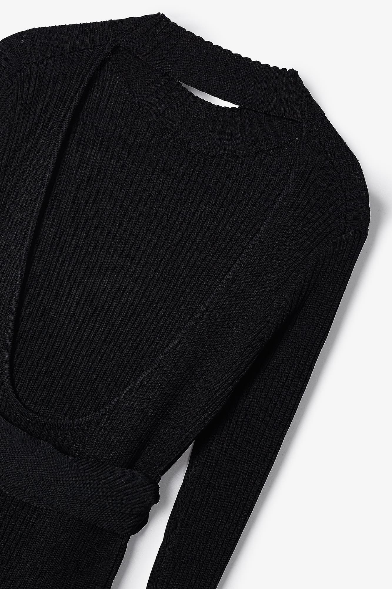 El vestido punto Sofia color negro con corte midi y fit entallado está confeccionado en un tejido de canalé ligeramente elástico. Espalda abierta, cuello caja y manga larga. Detalle de cinturón anudado en la cintura.