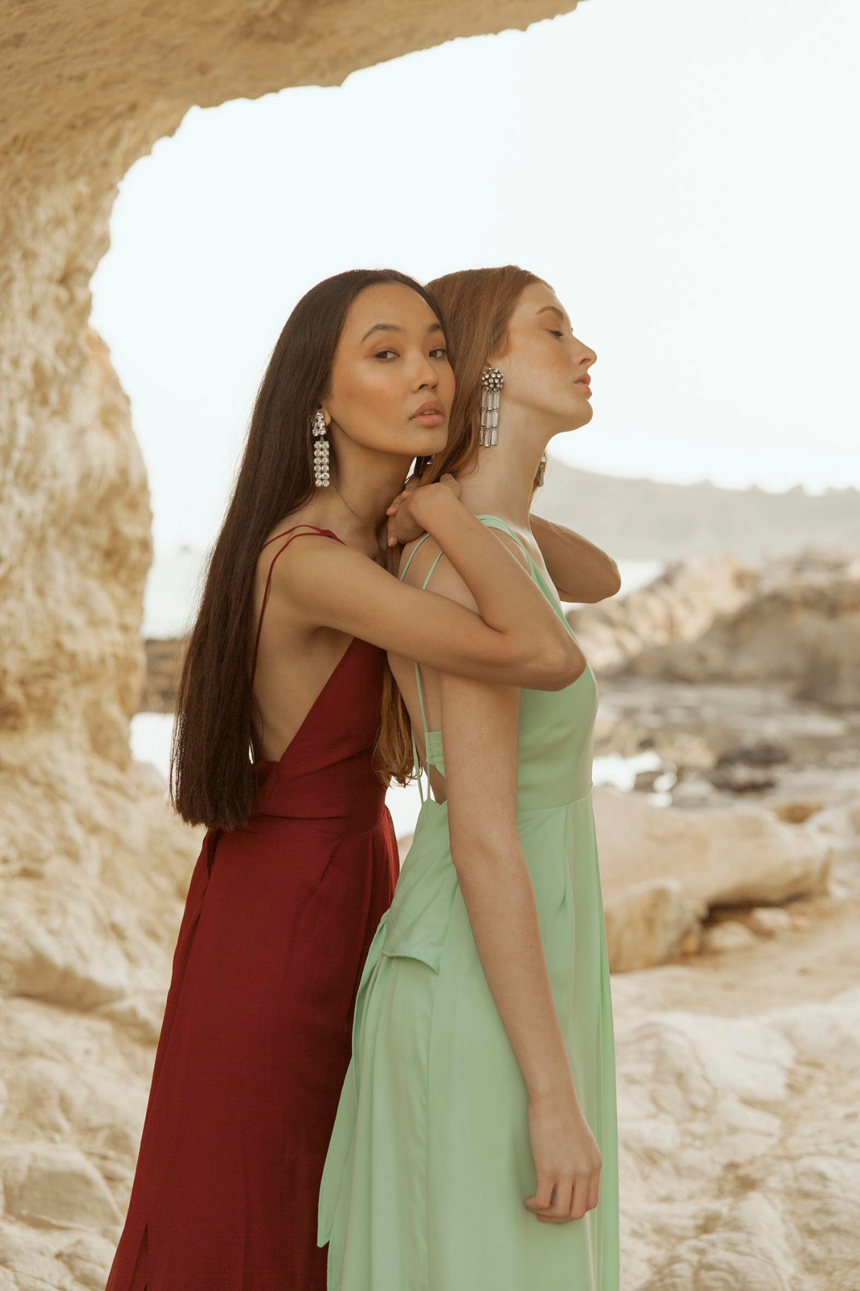 Vestido escote pico pronunciado, tirante doble muy fino, corte en cintura y lazada trasera.