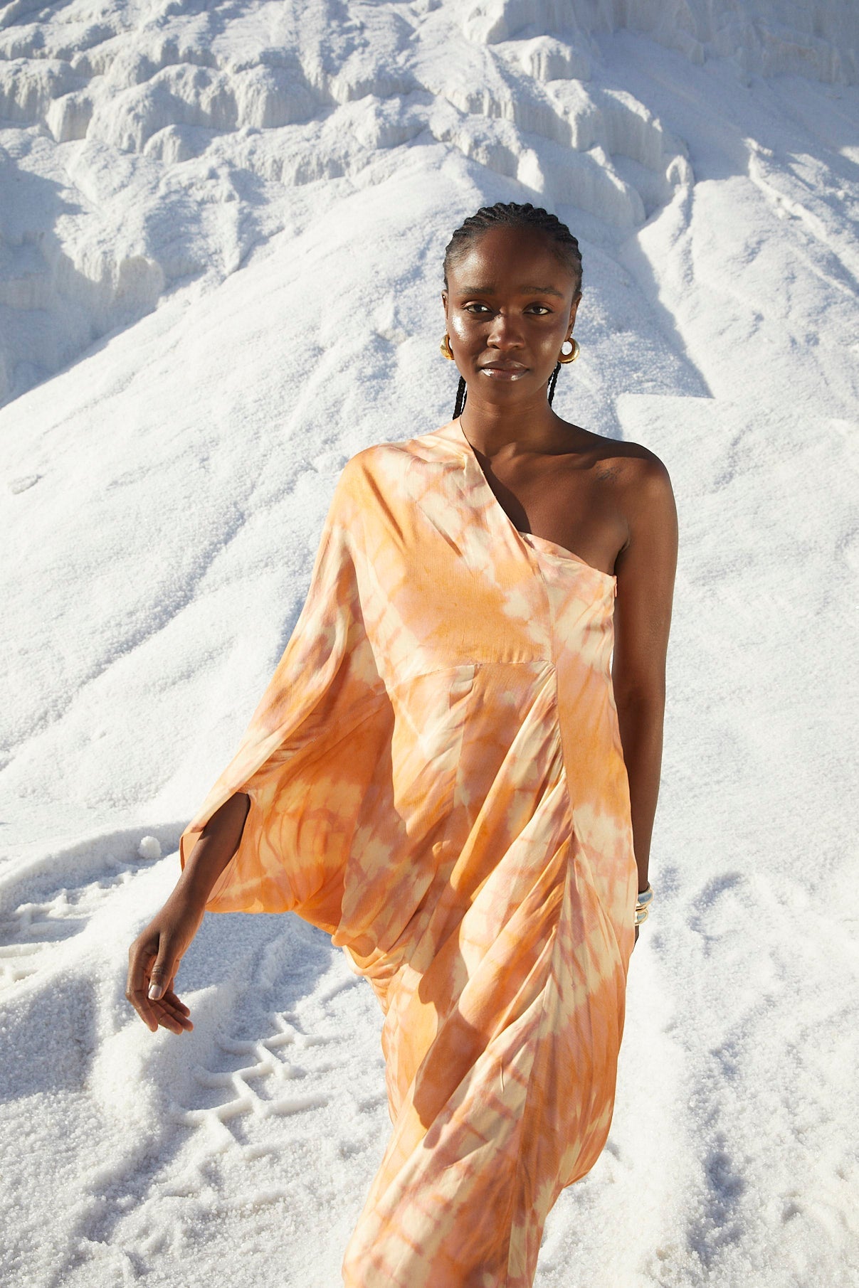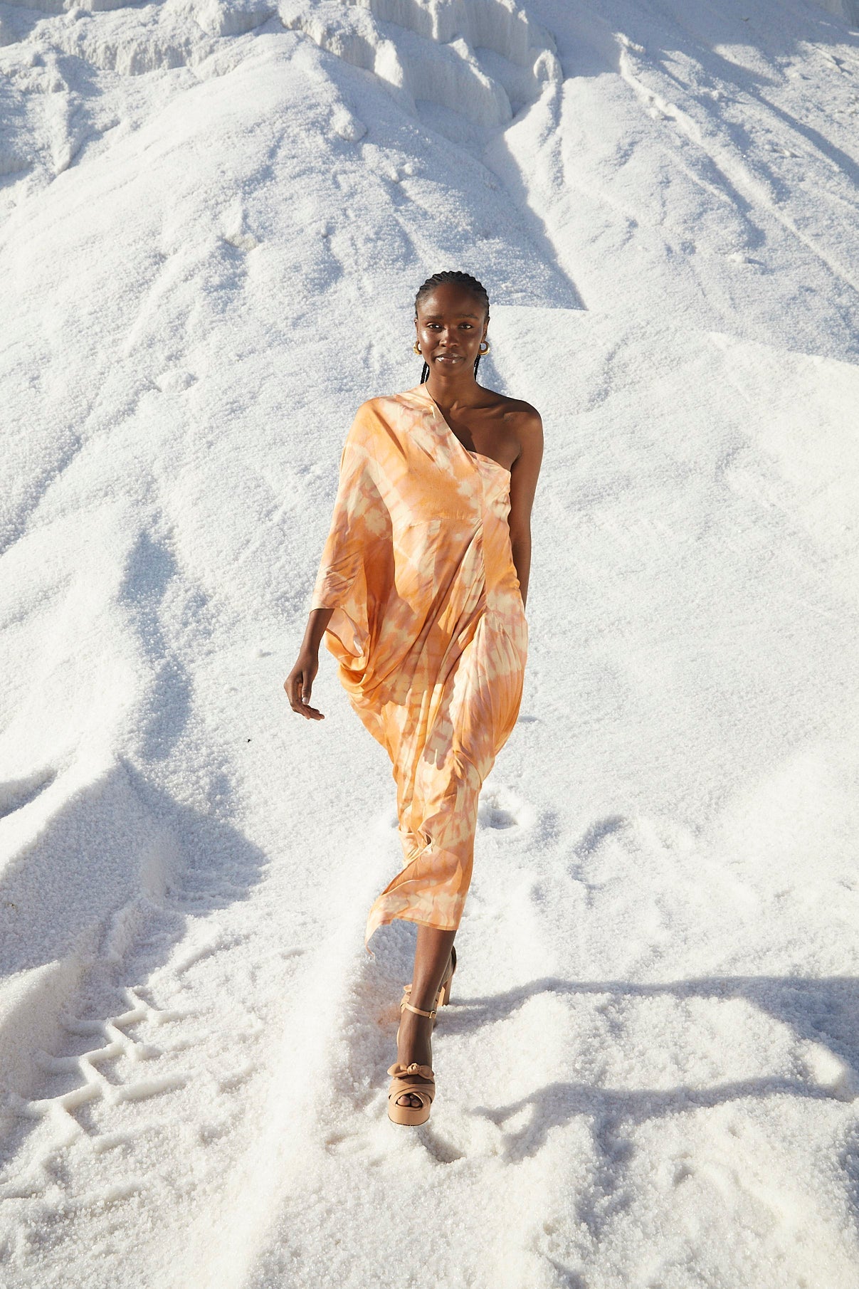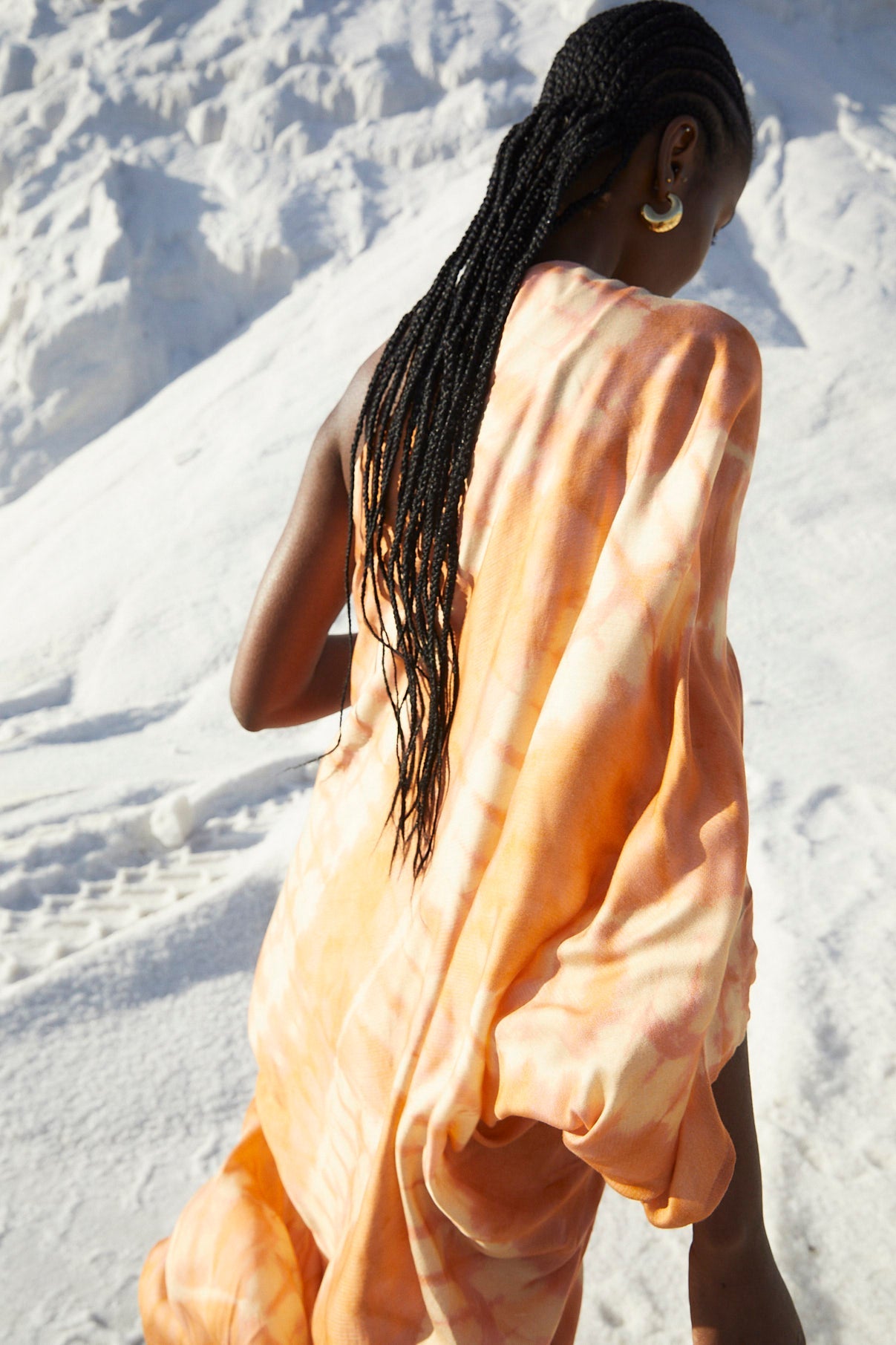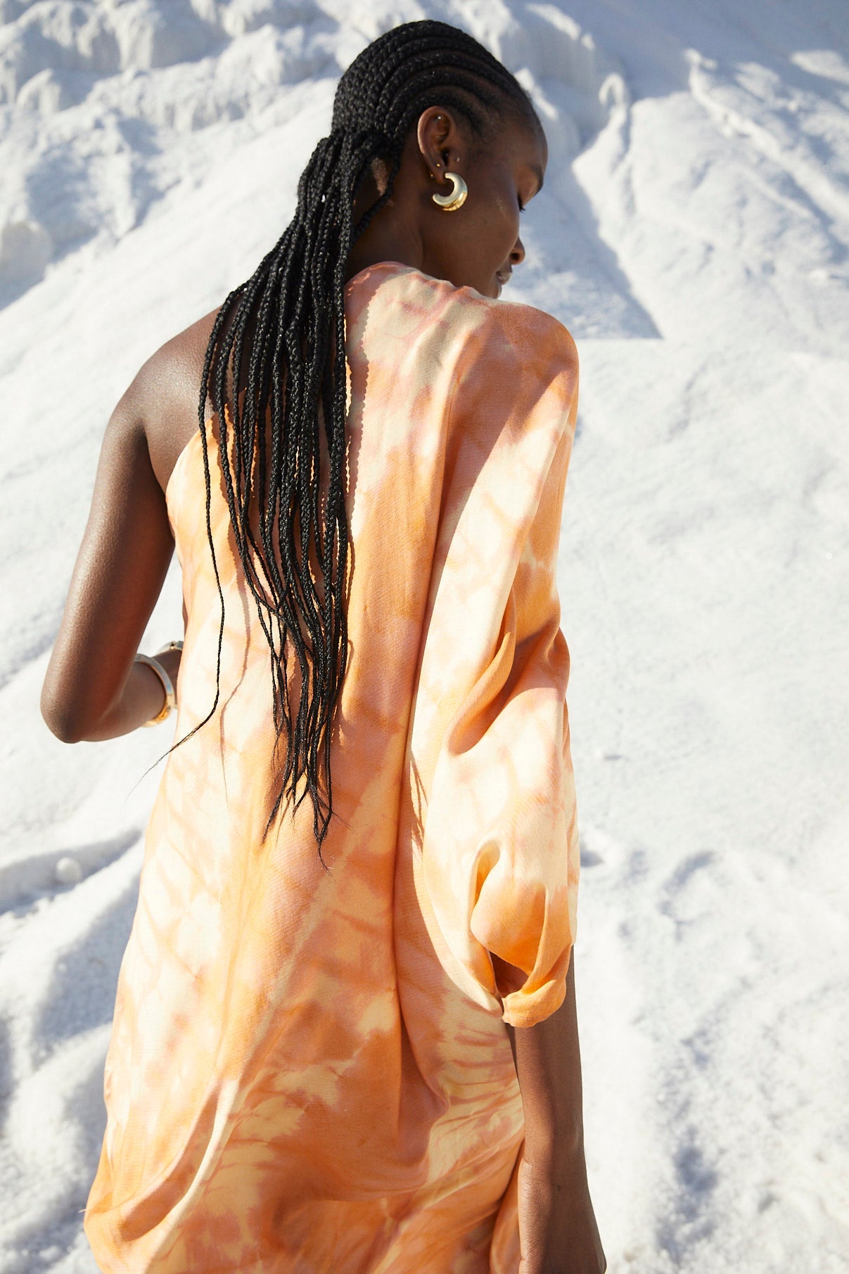 Vestido midi tipo túnica con un tejido desteñido en color nude. Una sola manga murciélago creando un escote asimétrico. Fruncido en el lateral. Cierre con cremallera invisible.
