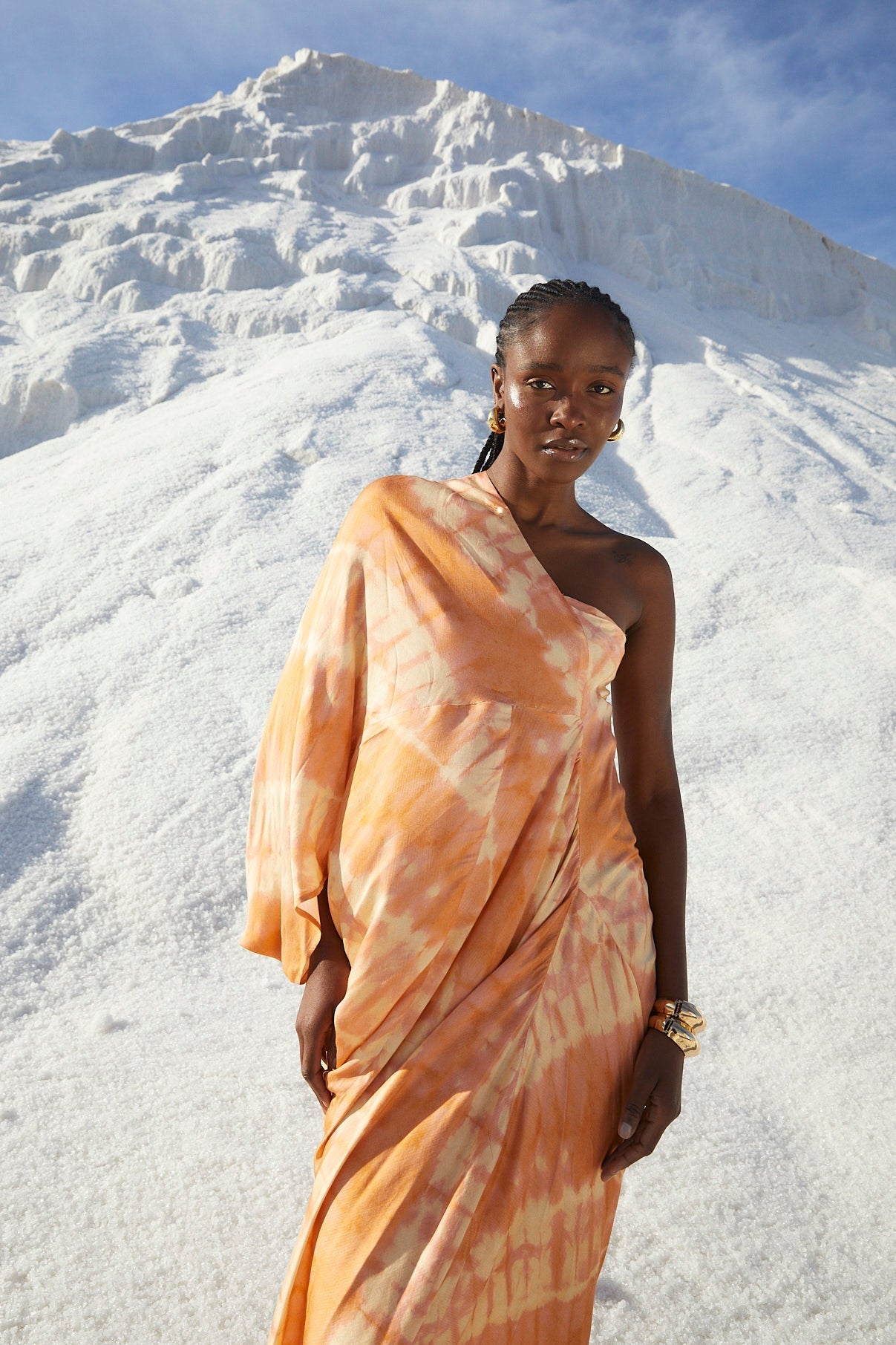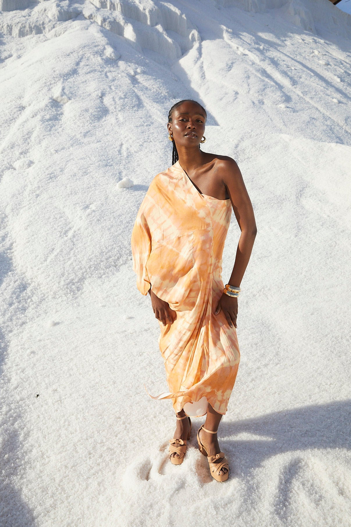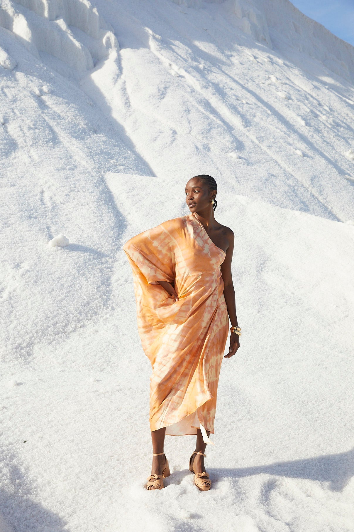 Vestido midi tipo túnica con un tejido desteñido en color nude. Una sola manga murciélago creando un escote asimétrico. Fruncido en el lateral. Cierre con cremallera invisible.