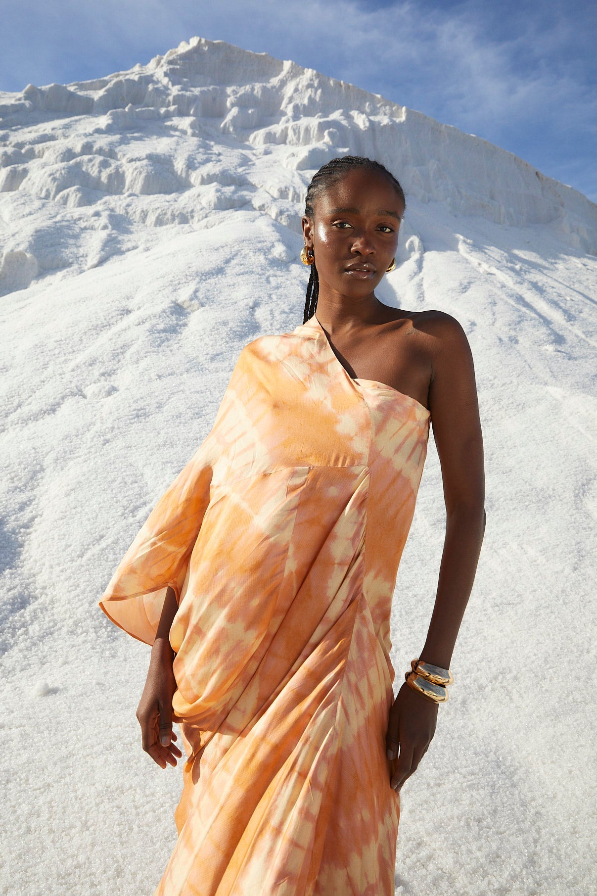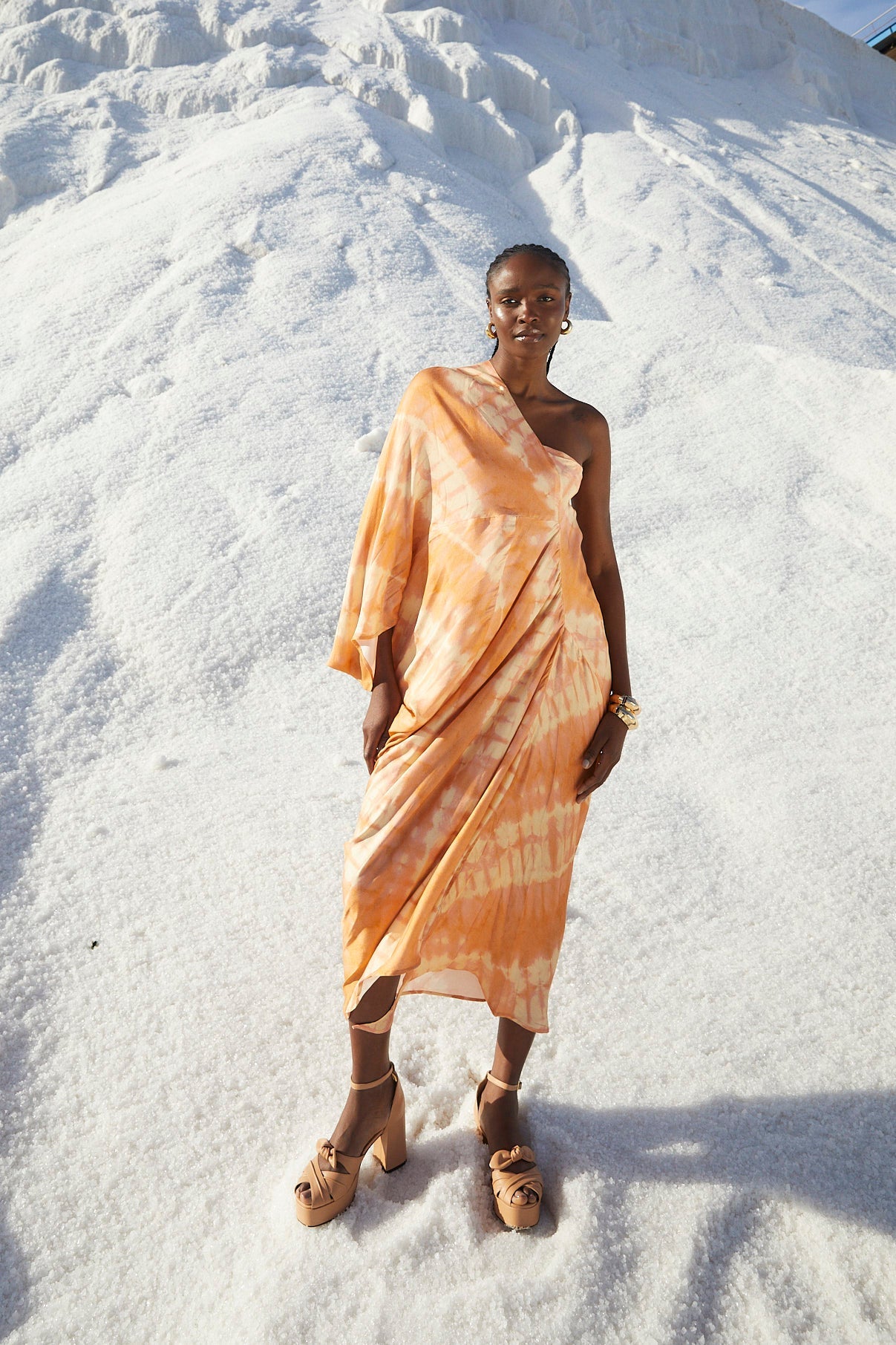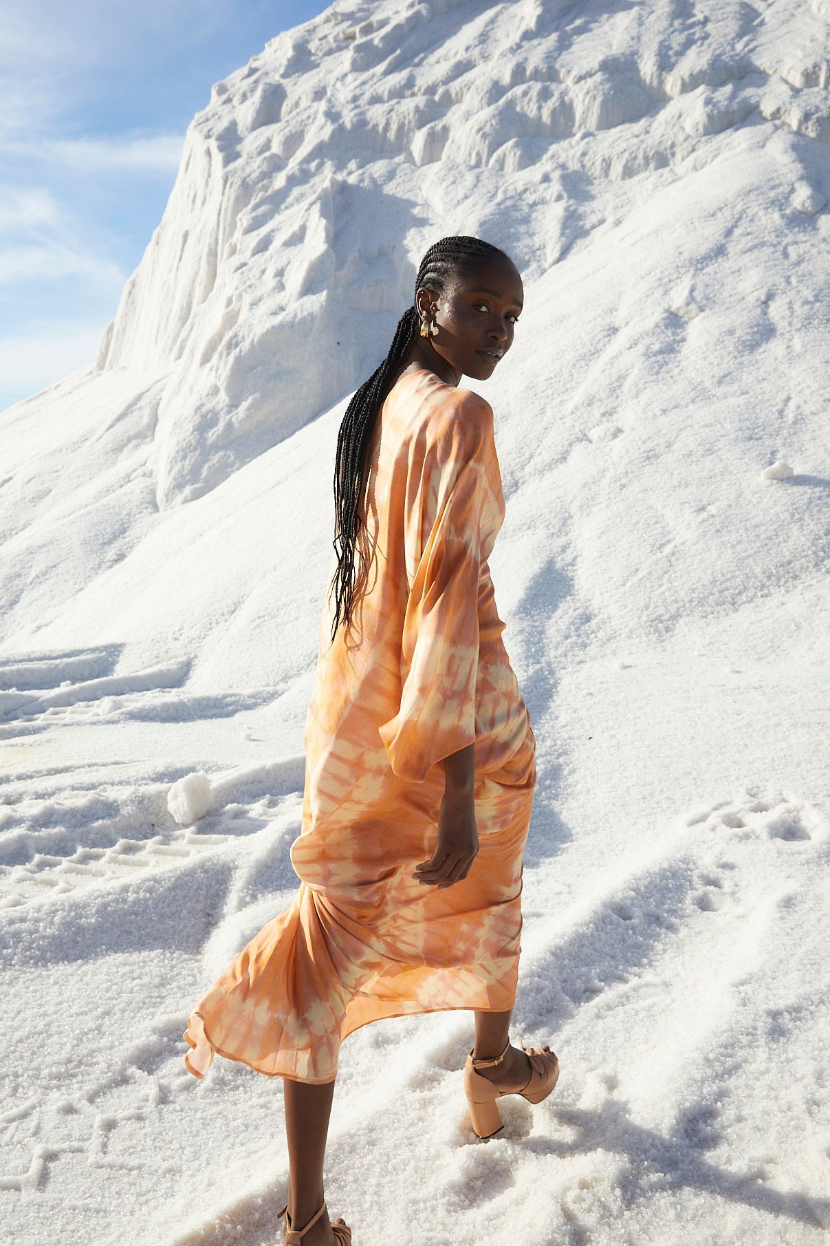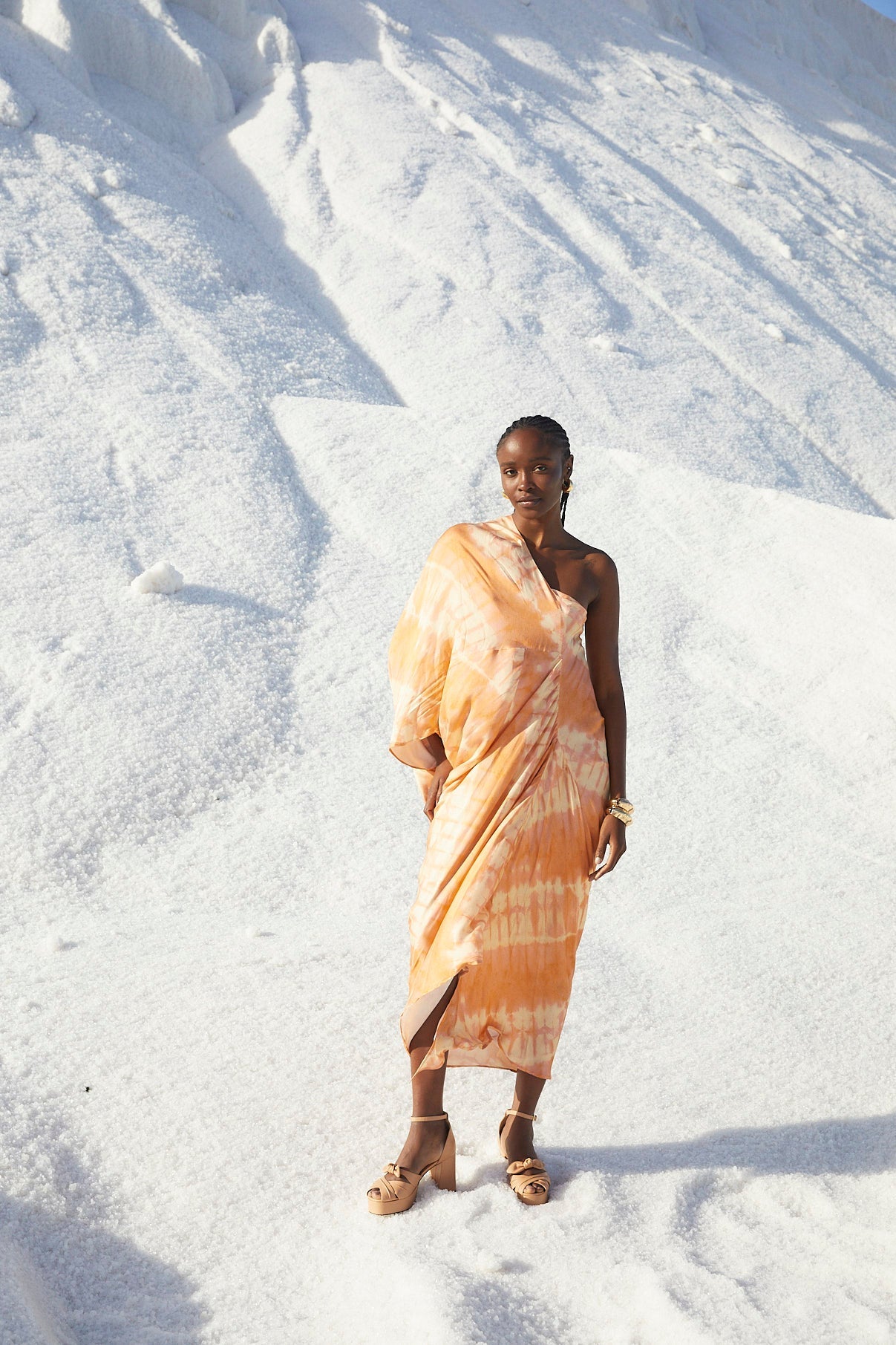Vestido midi tipo túnica con un tejido desteñido en color nude. Una sola manga murciélago creando un escote asimétrico. Fruncido en el lateral. Cierre con cremallera invisible.