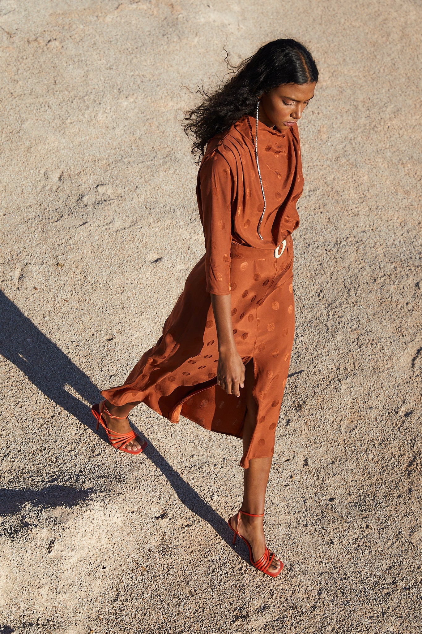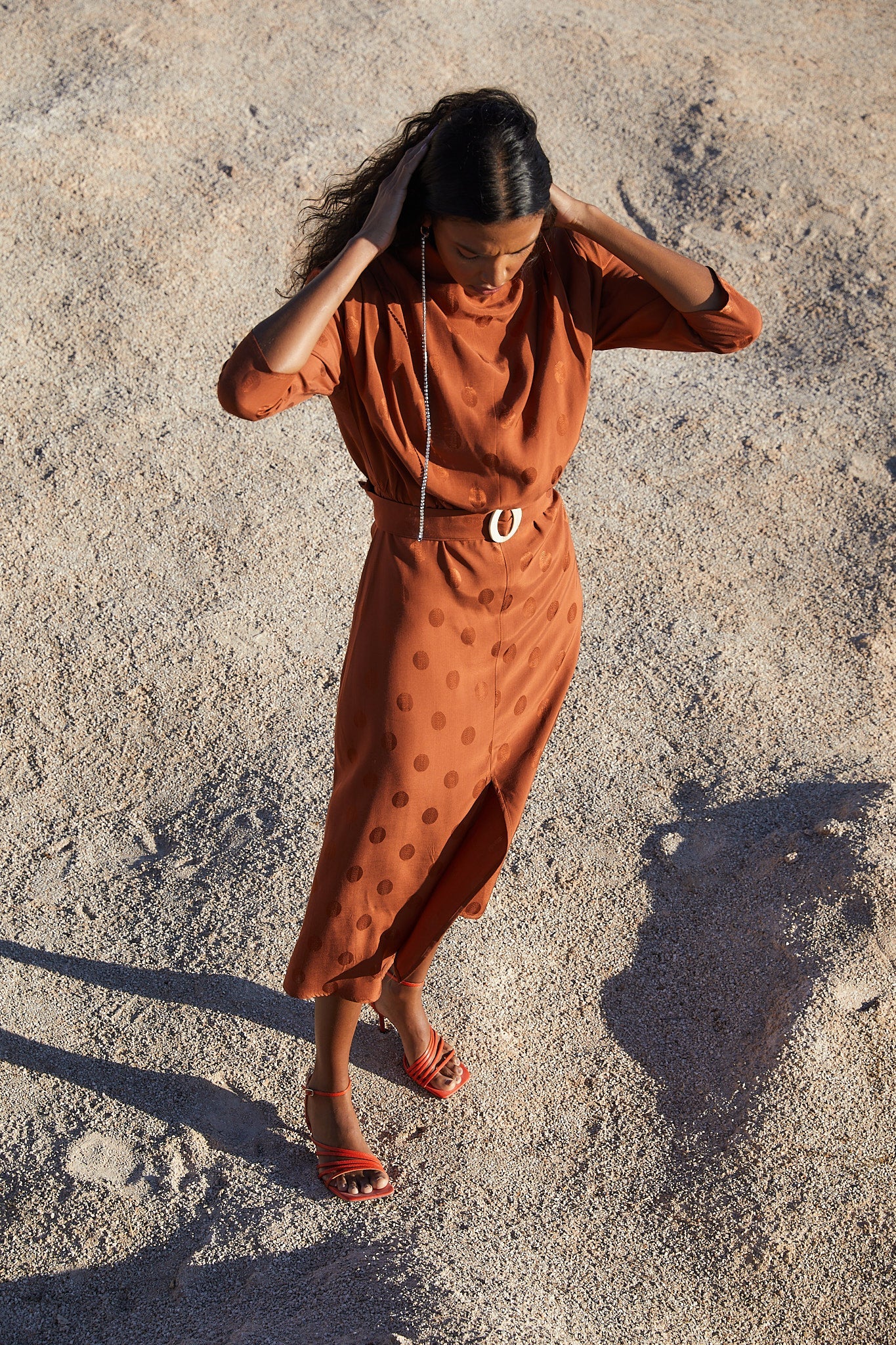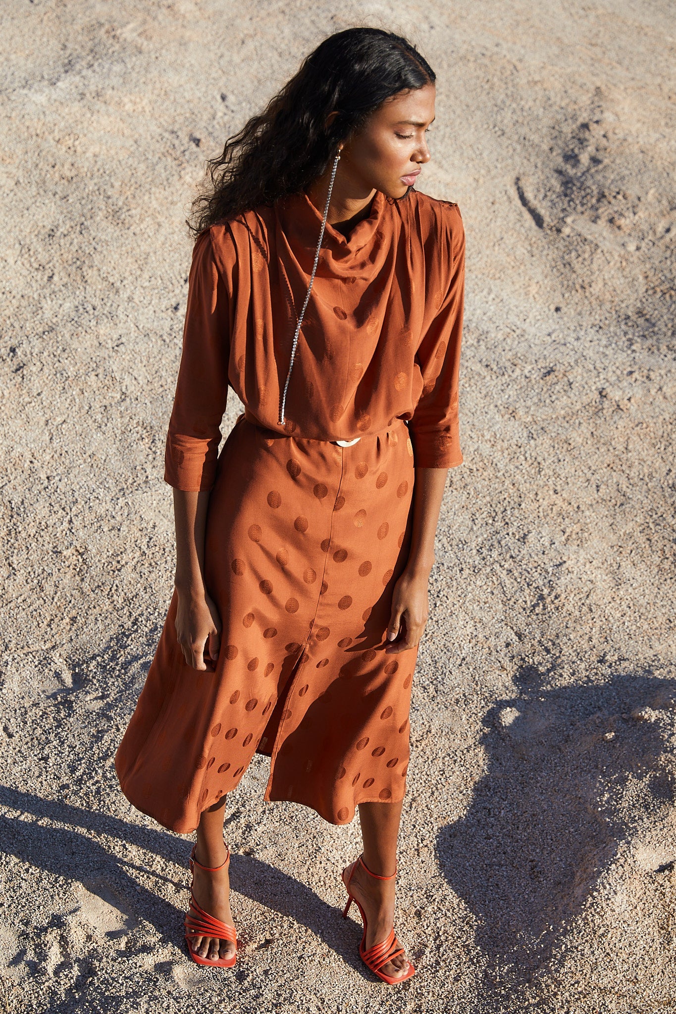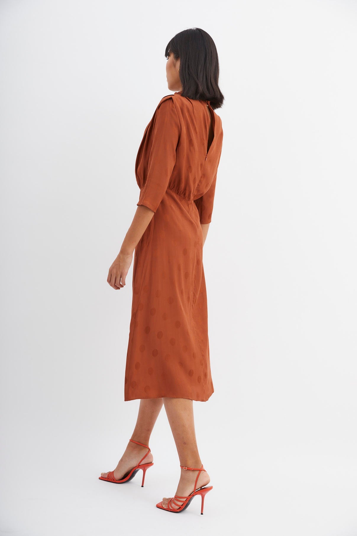 Vestido con cuello perkins hombreras y pliegues en los hombros. Manga francesa y cinturón con hebilla de resina que entalla en la cintura para resaltar la silueta. Falda con largo midi y abertura frontal.