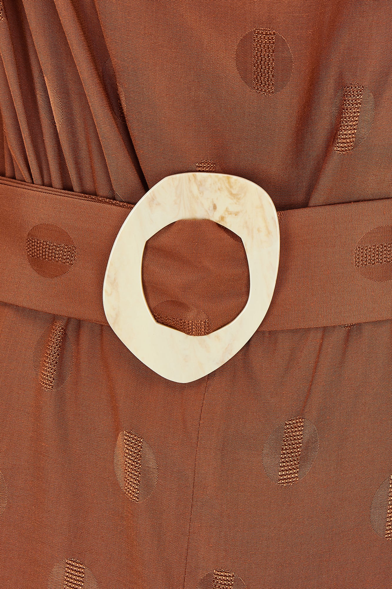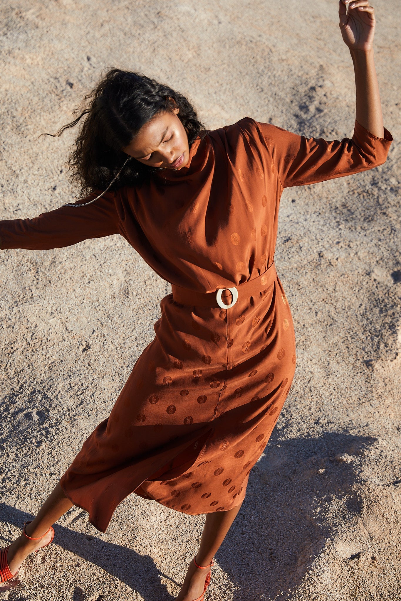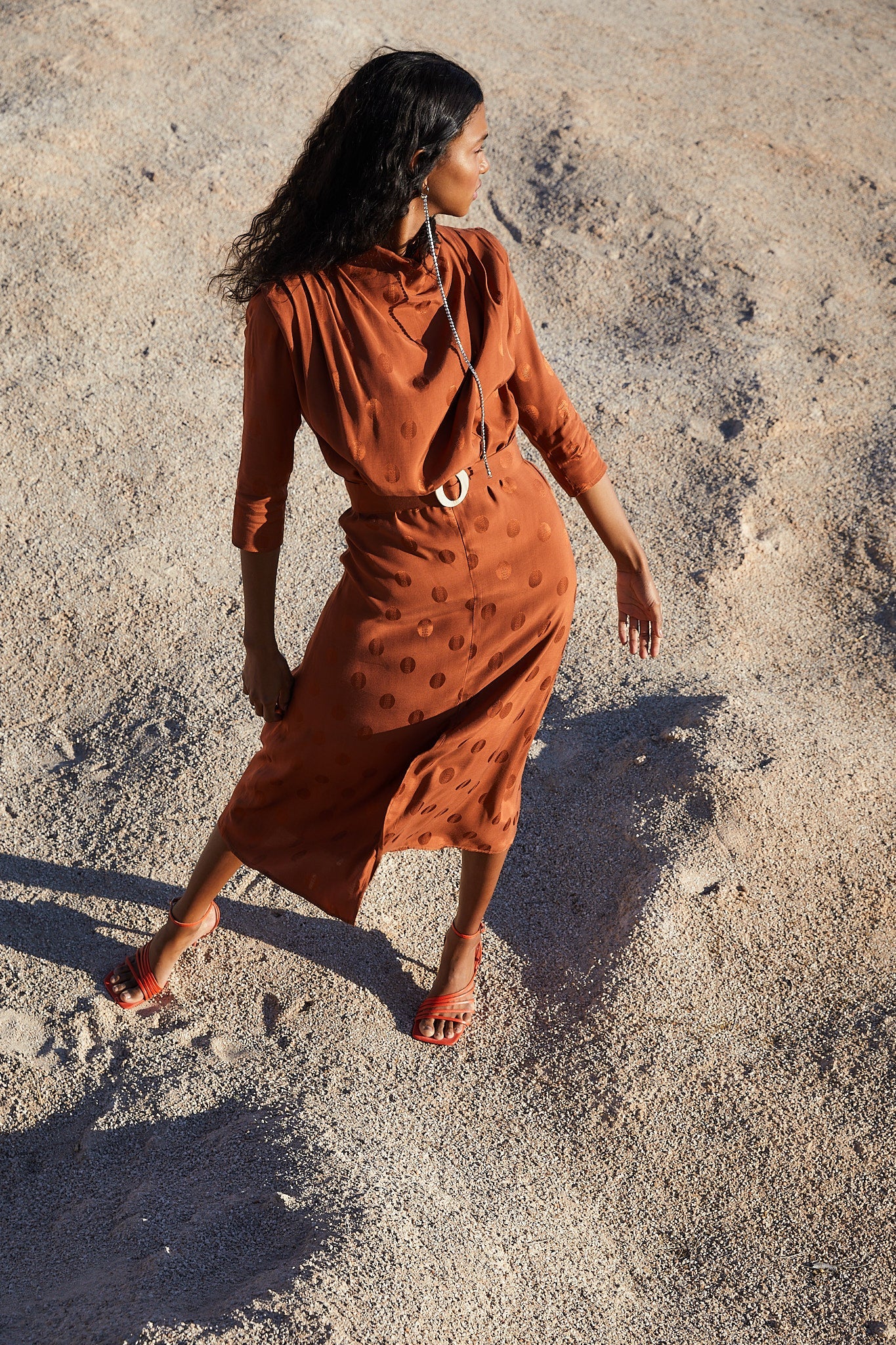 Vestido con cuello perkins hombreras y pliegues en los hombros. Manga francesa y cinturón con hebilla de resina que entalla en la cintura para resaltar la silueta. Falda con largo midi y abertura frontal.