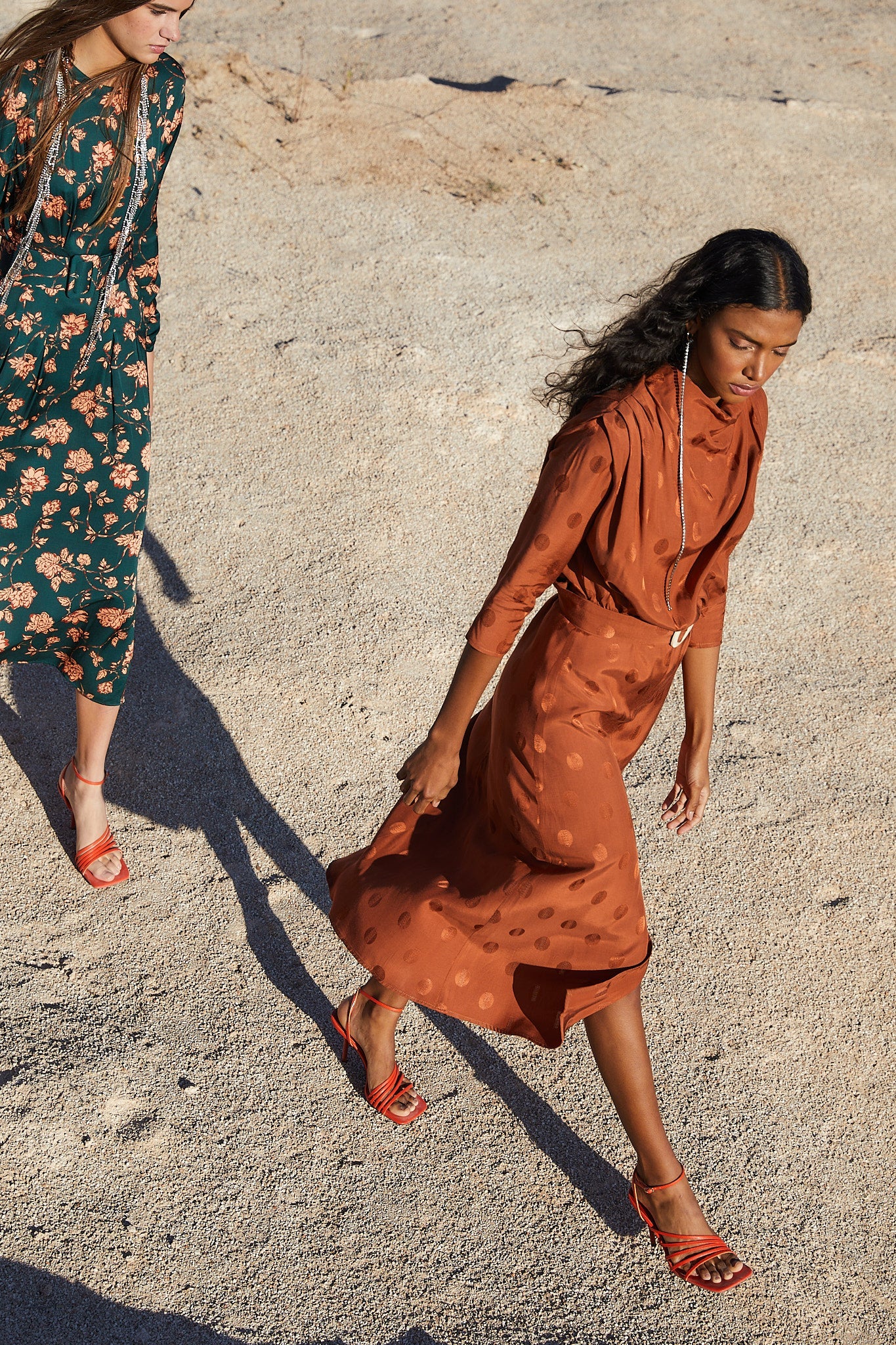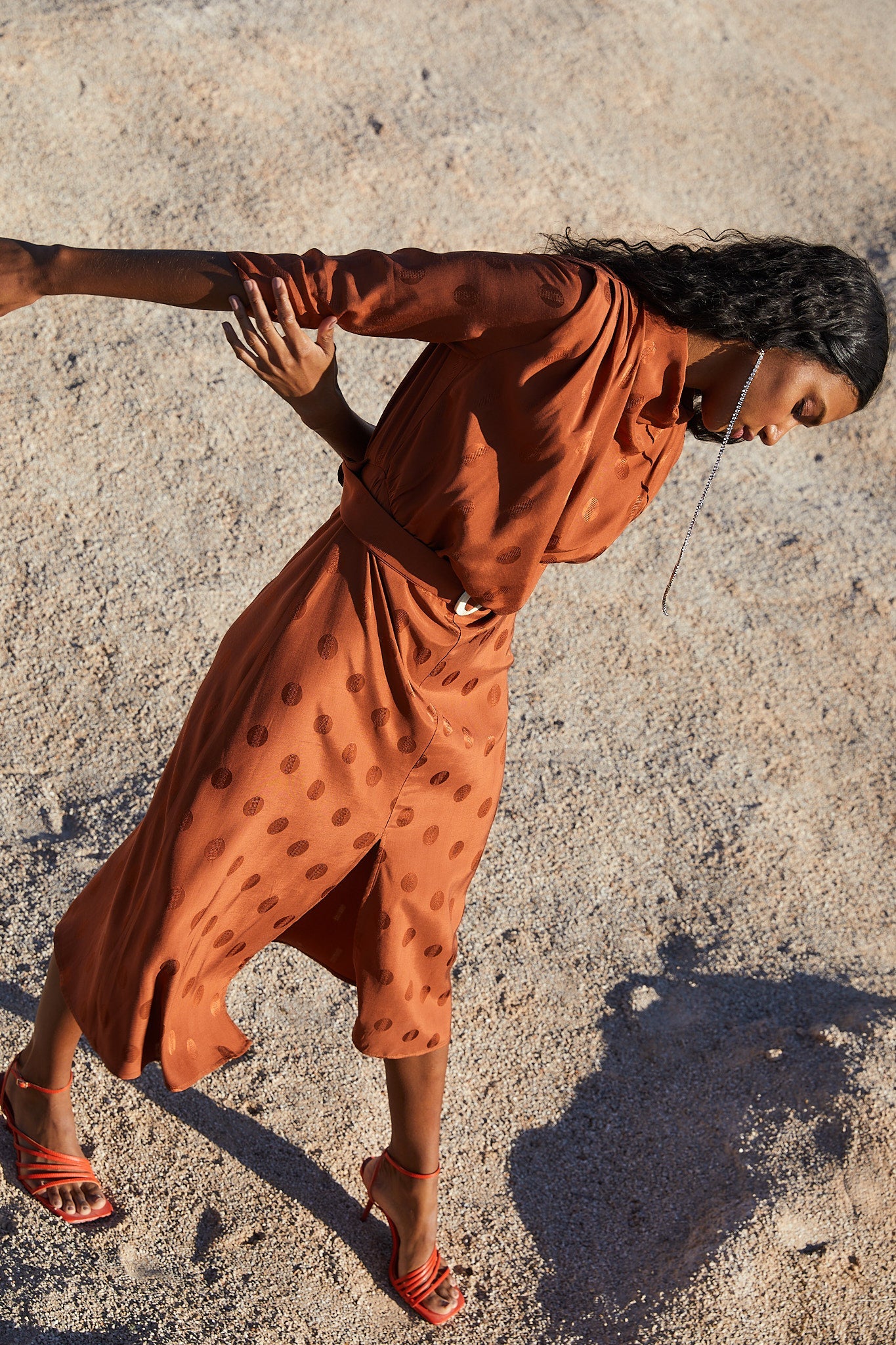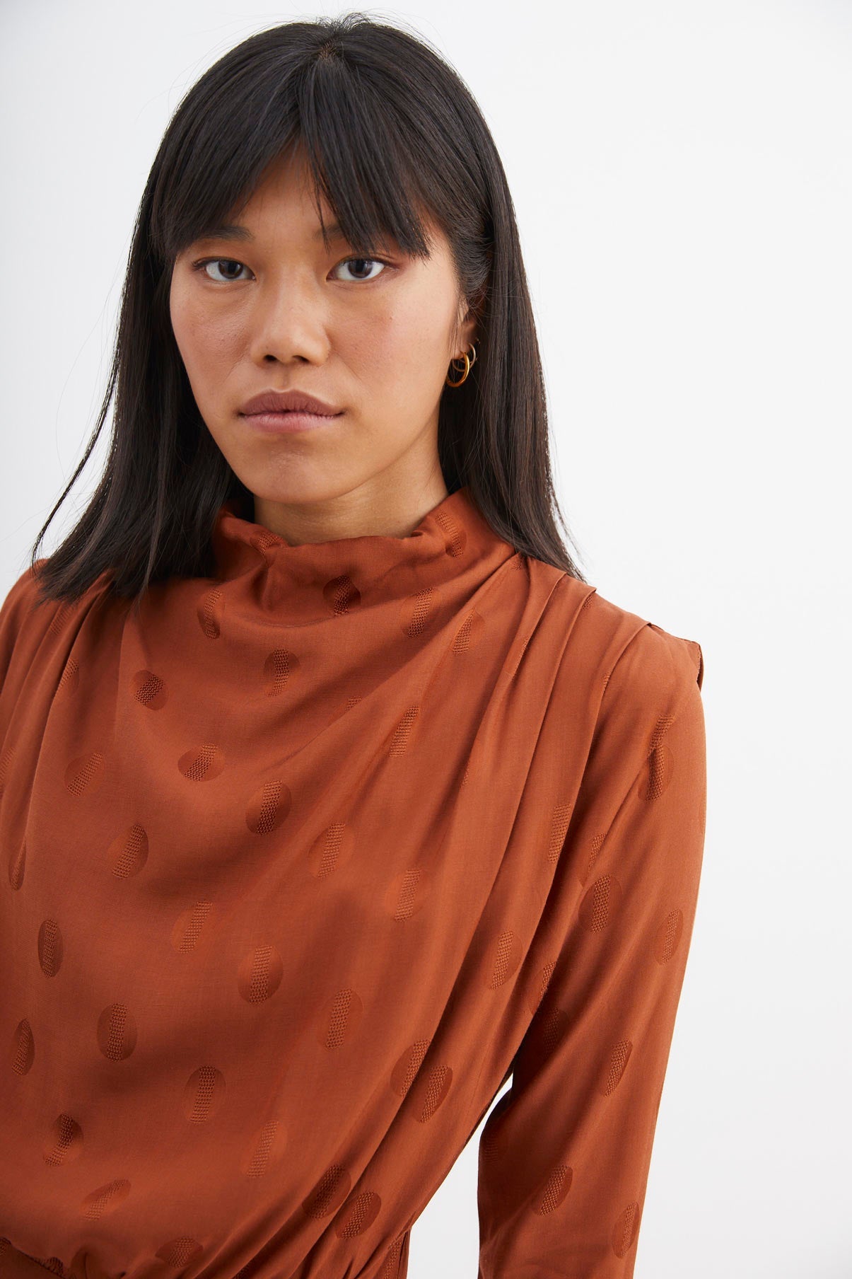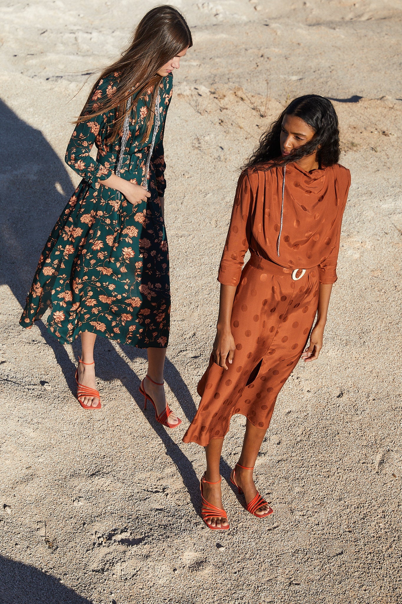 Vestido con cuello perkins hombreras y pliegues en los hombros. Manga francesa y cinturón con hebilla de resina que entalla en la cintura para resaltar la silueta. Falda con largo midi y abertura frontal.