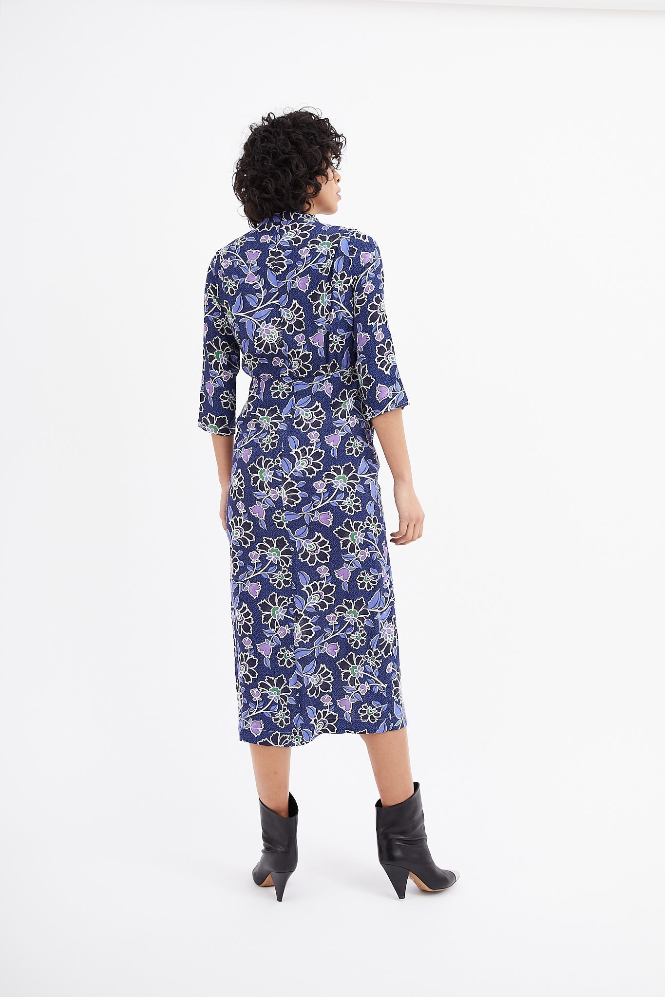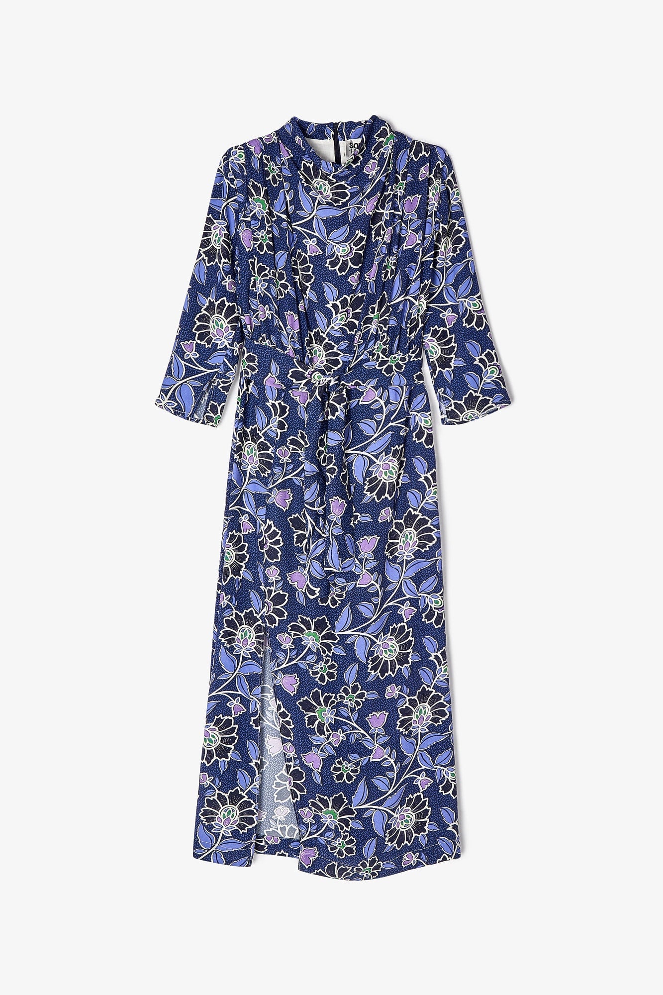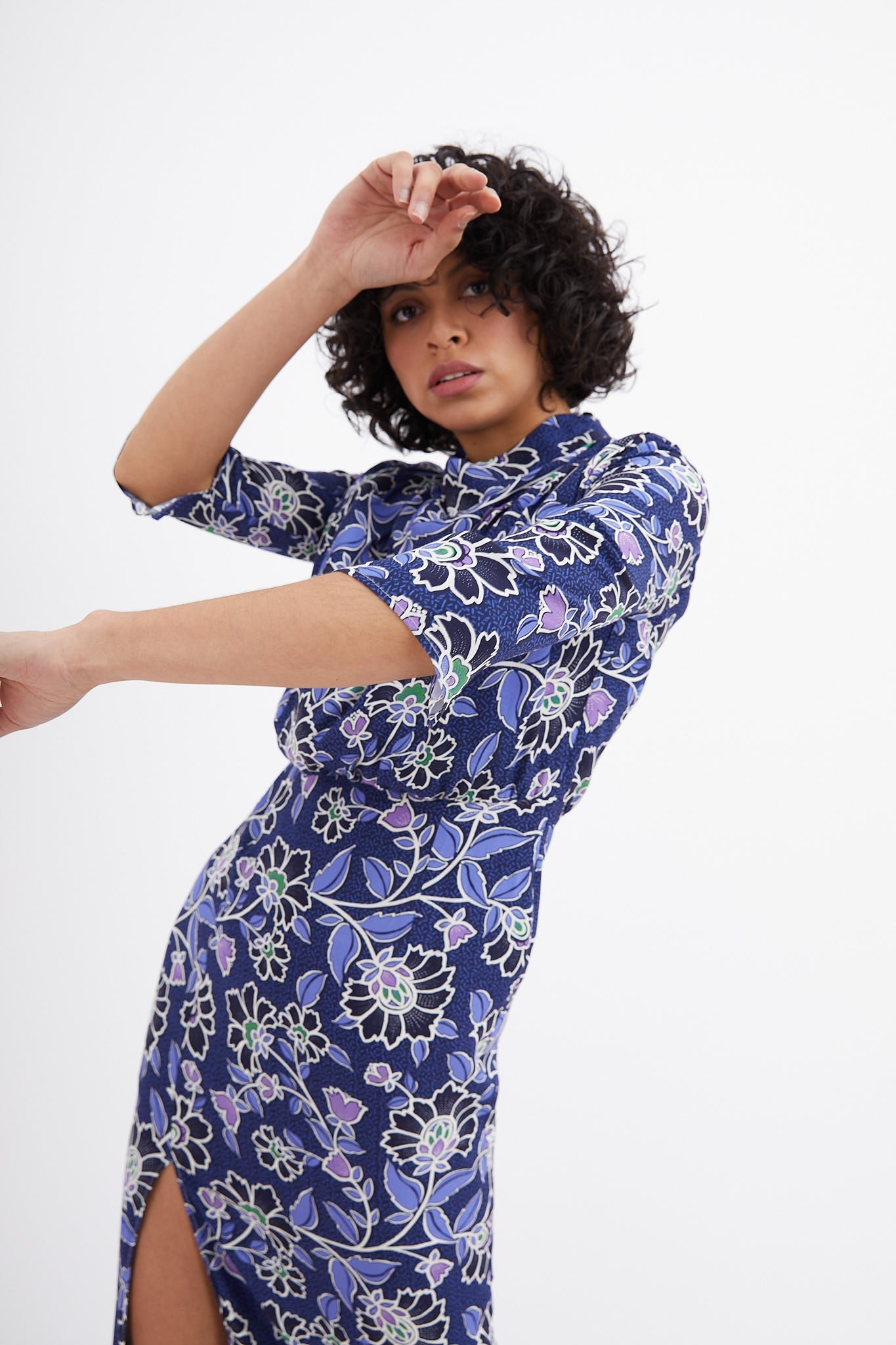 Vestido con cuello perkins y pliegues en los hombros. Manga francesa y cinturón con hebilla forrada que entalla en la cintura para resaltar la silueta. Falda con largo midi y abertura frontal.