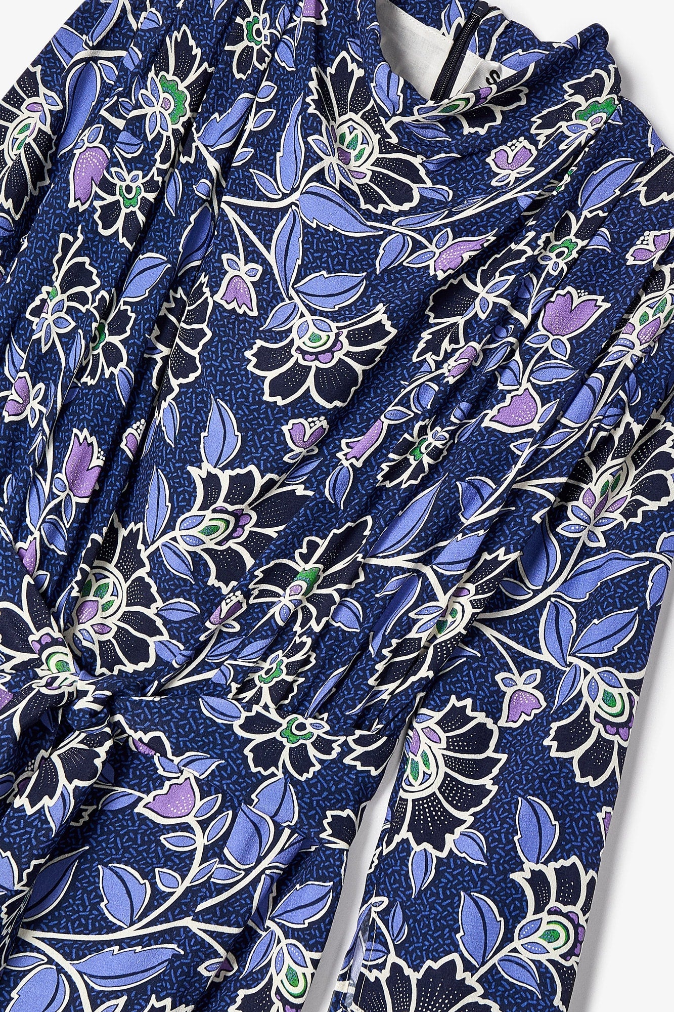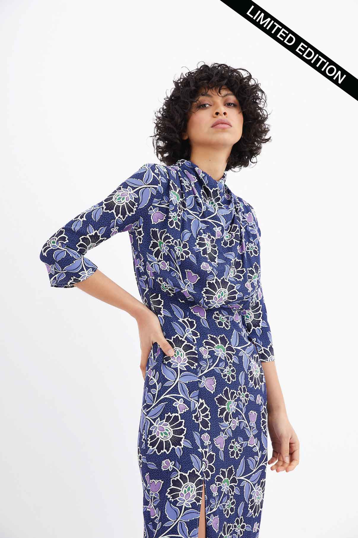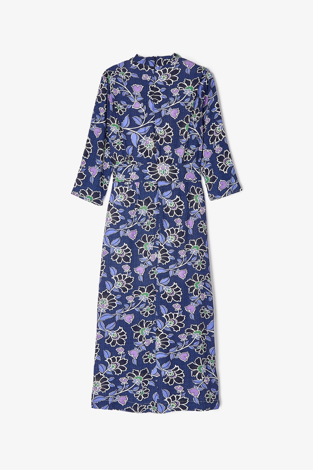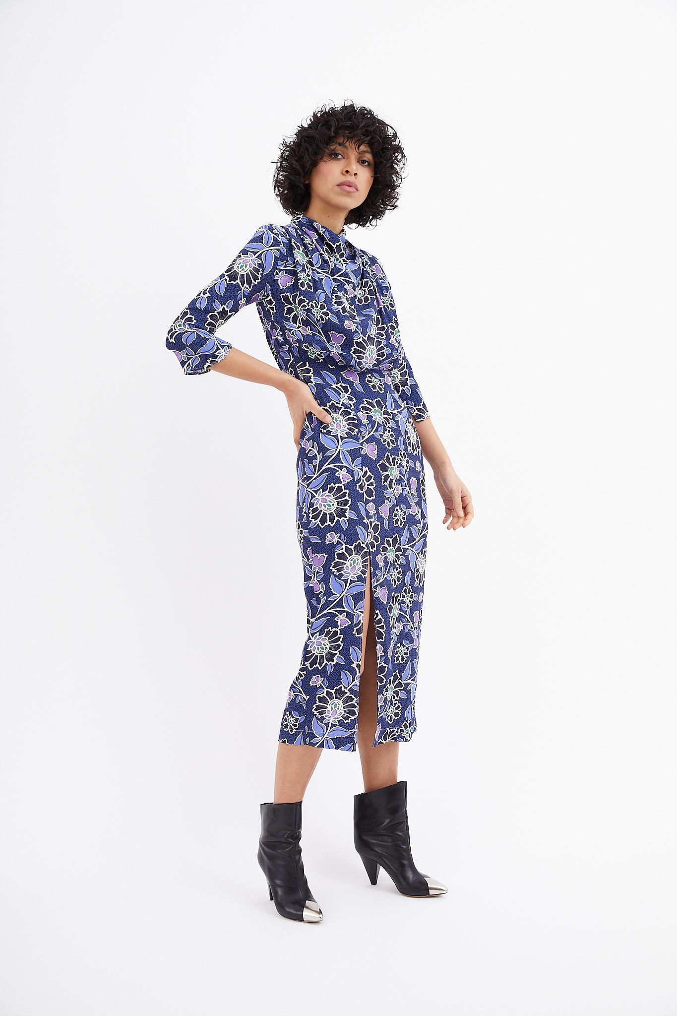 Vestido con cuello perkins y pliegues en los hombros. Manga francesa y cinturón con hebilla forrada que entalla en la cintura para resaltar la silueta. Falda con largo midi y abertura frontal.