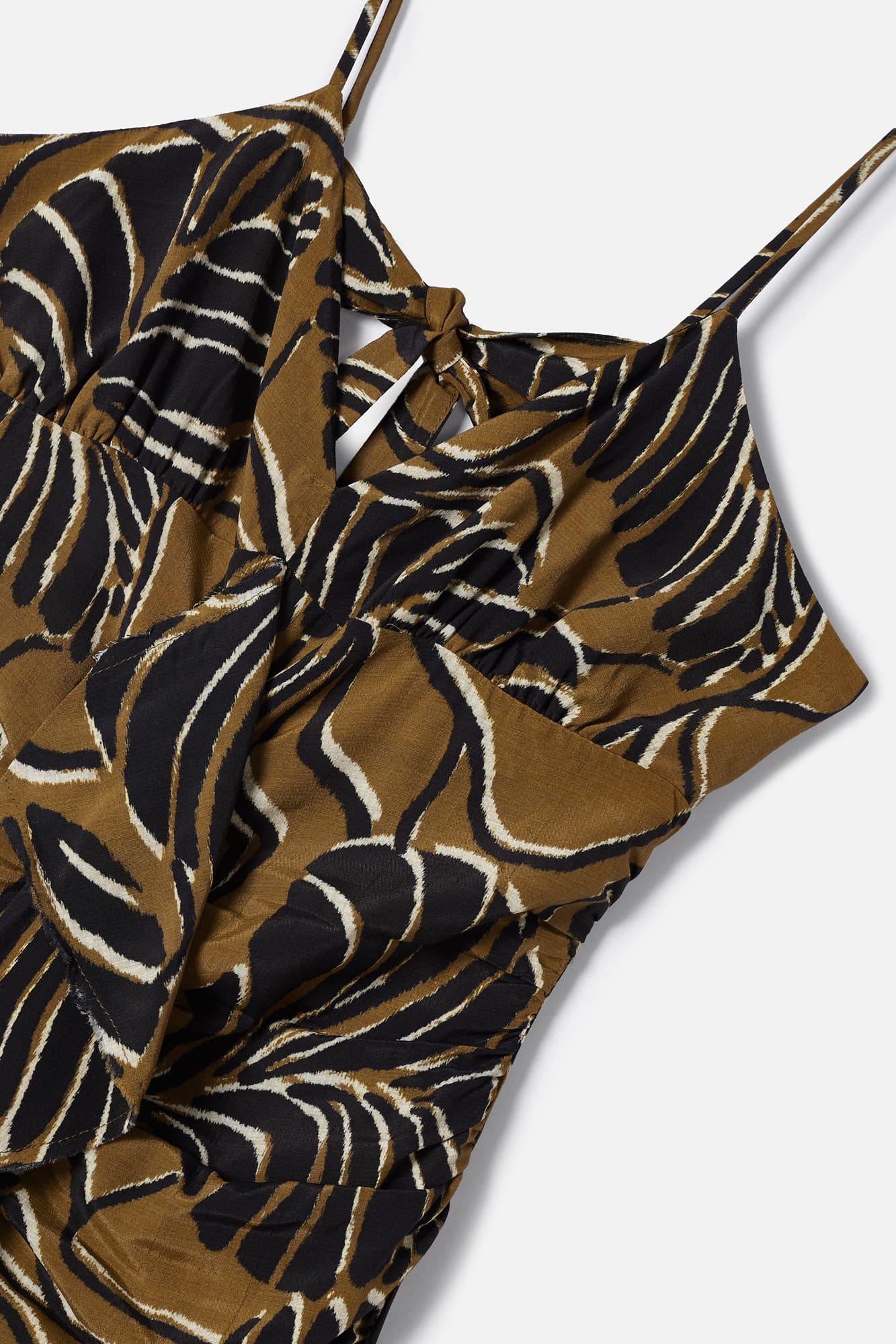 Vestido tobillero confeccionado en un tejido de viscosa estampado. Nuestro vestido Virt es de tirantes con escote de pico. Tiene una abertura en la parte delantera para proporcionar movimiento. Espalda abierta donde se encuentra el cierre mediante un nudo y una cremallera invisible en la parte inferior.
